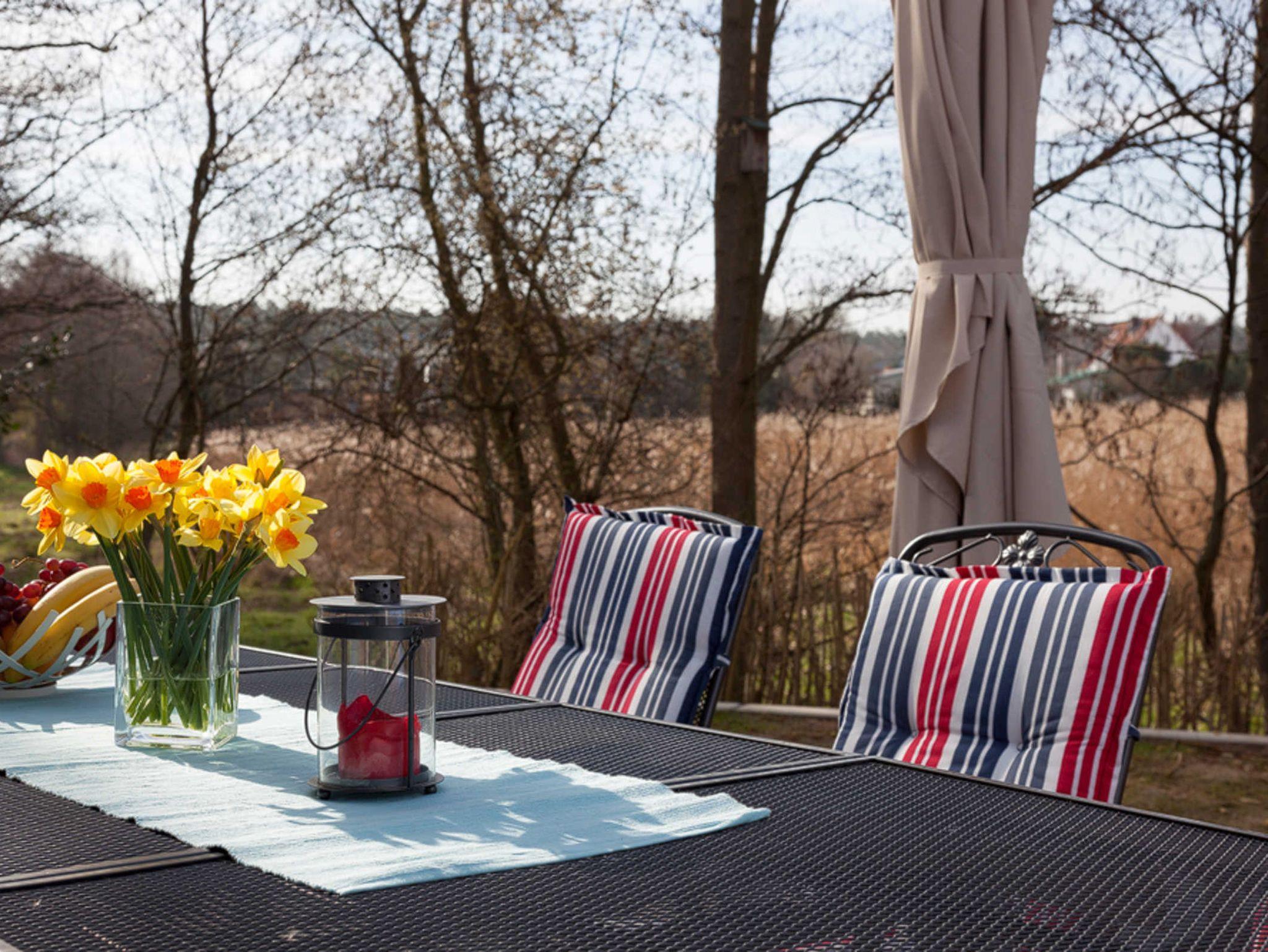 • Terrasse: 4x6m große Terrassen mit hochwertigen Streckmetallmöbeln, herrlichem Weitblick auf die Müritzer Wiesen, Holzkohlegrill, Außendusche mit Warm-Kaltwasser (nicht im Winter), komplett eingezäunt, diverse Rasenflächen, Sonnenschirm