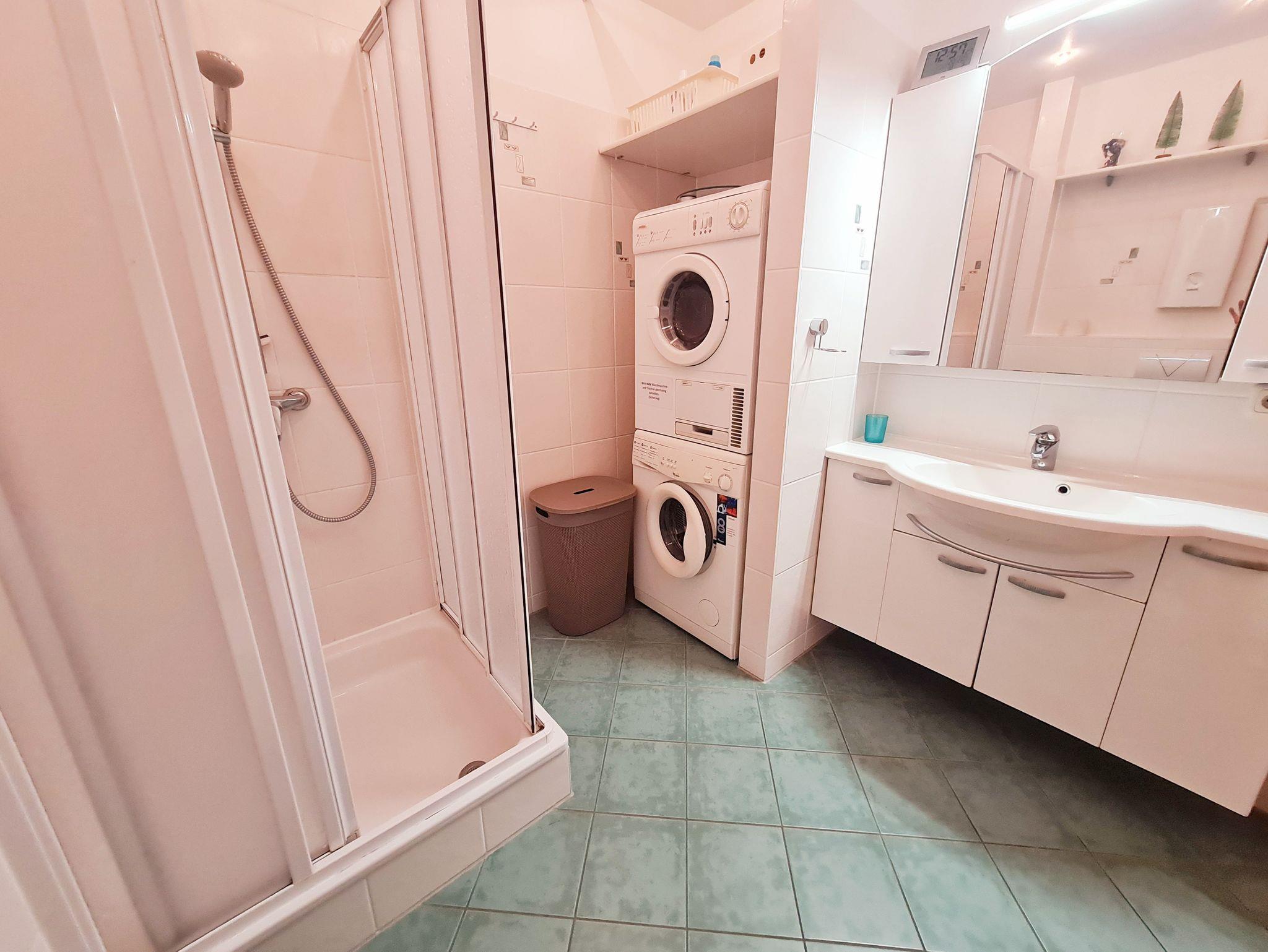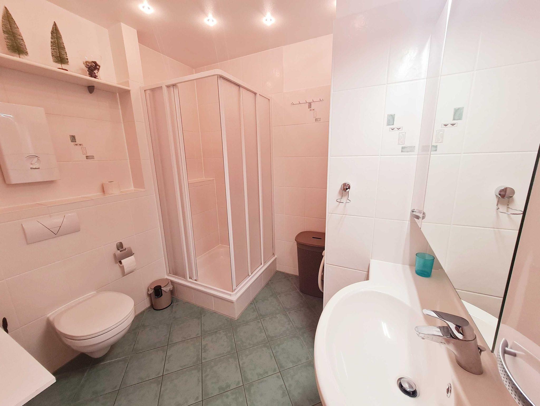 • Bad: ohne Fenster, Dusche, Waschbecken, Toilette, Spiegelschrank, Unterschrank Waschbecken, Wäschekorb, Handtuchhalter, Waschmaschine und Trockner