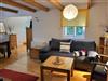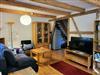 Das offene Wohnzimmer verfügt über eine Couchecke mit einem Fernseher und einem Esstisch. Im Wohnzimmer befindet sich ein Kaminofen.
