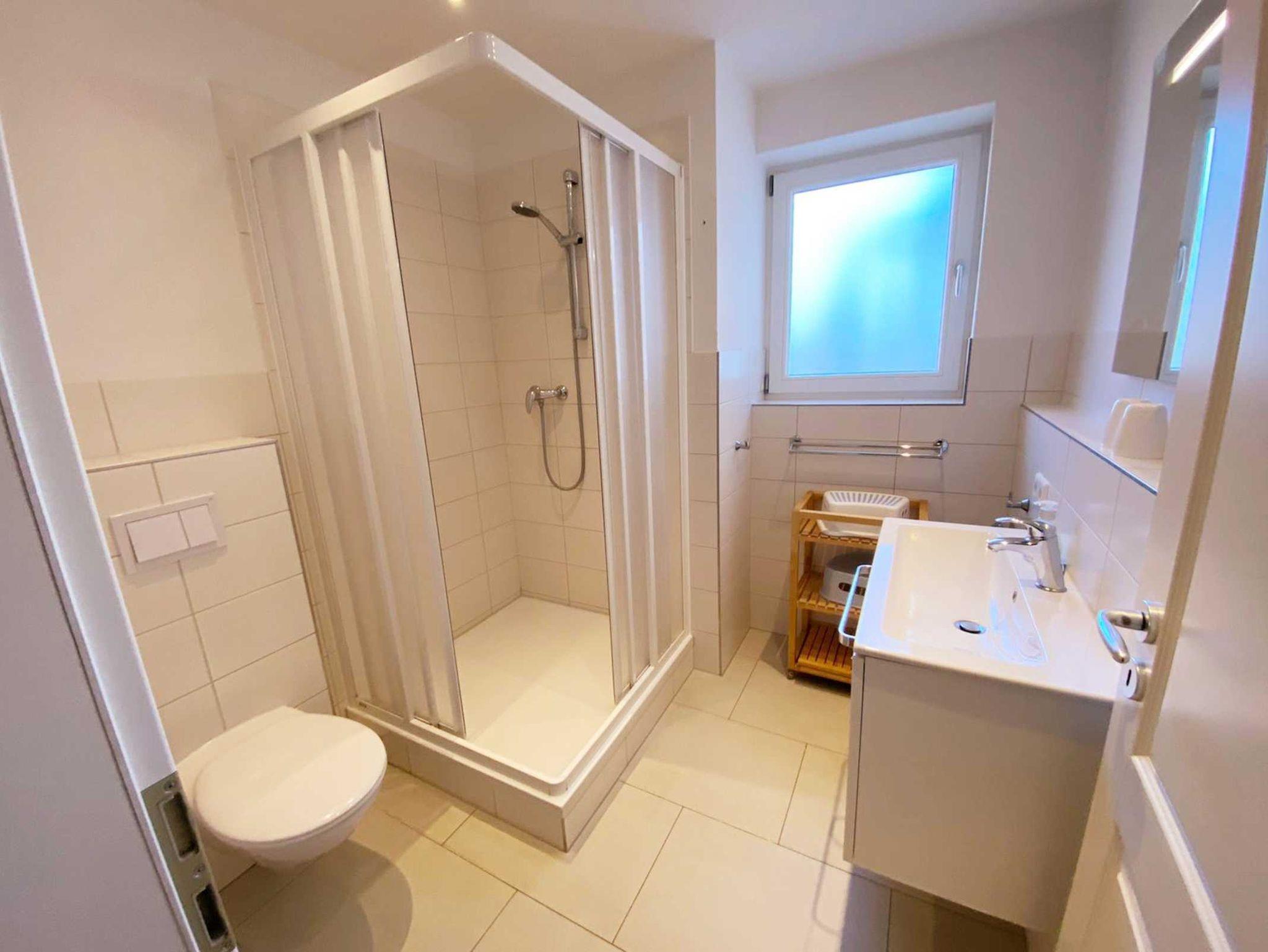 • Badezimmer: mit Fenster, Dusche, WC, Waschbecken mit Unterschrank, Handtuchhalter, Spiegel, Regal, Tritt