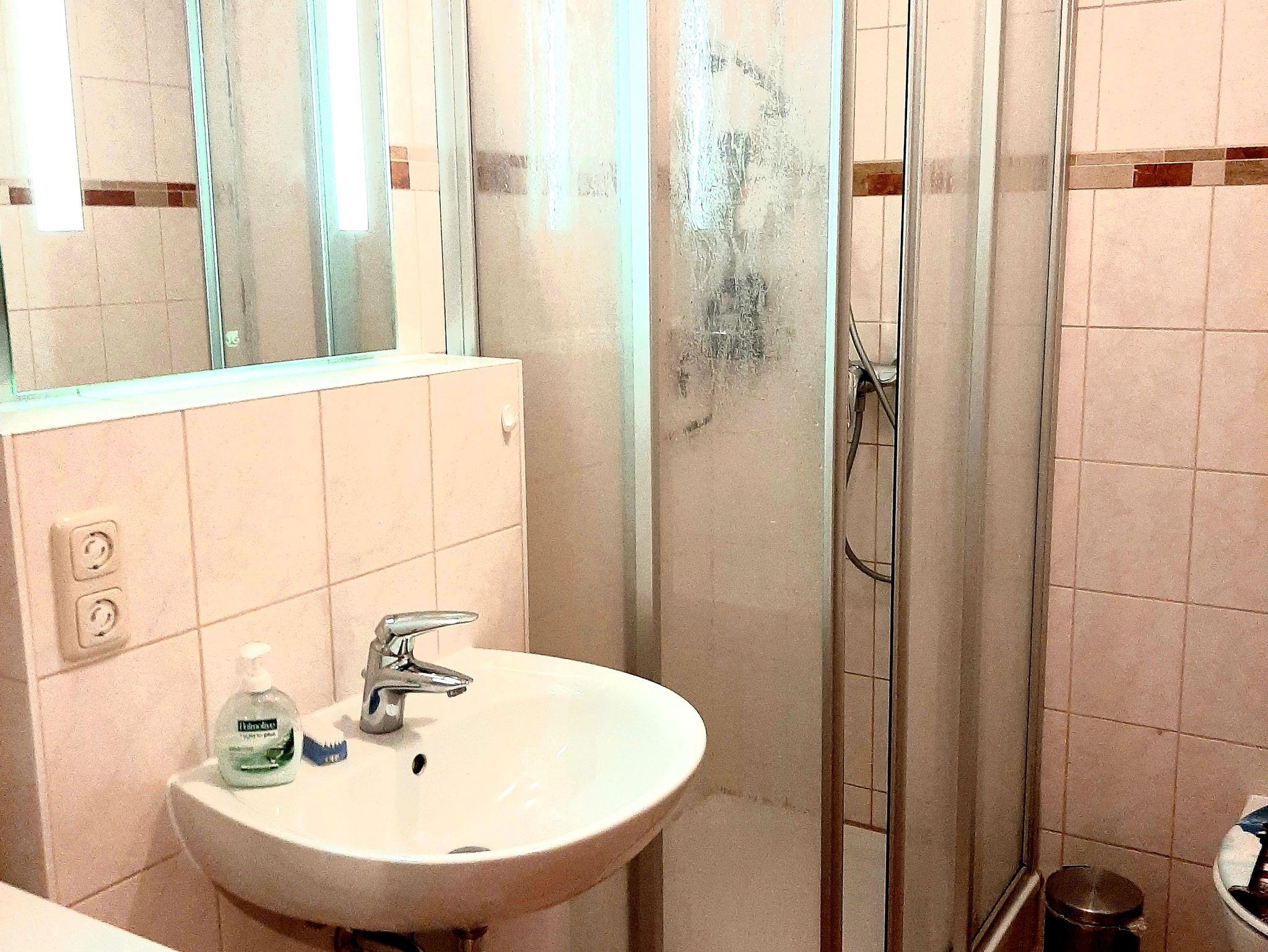 • Badezimmer: ohne Fenster, mit Dusche, WC, Waschbecken, Handtuchhaken und Waschmaschine (Wäschetrockner gegen Gebühr im Hause)