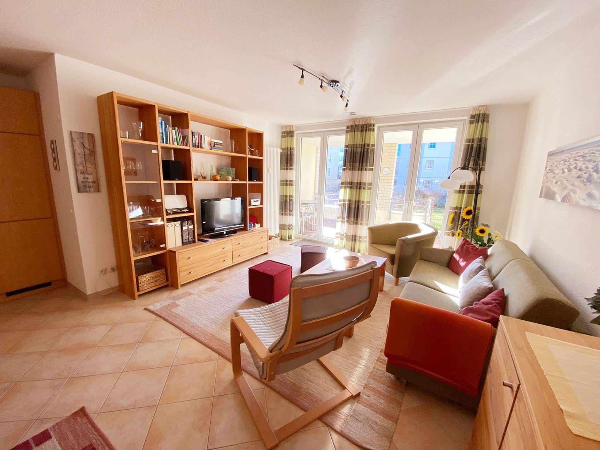 • Wohnzimmer: gemütliche Schlafcouch mit 1,50x2,00m, zwei gemütlichen Sesseln zum relaxen mit Hocker, Flachbild-TV, Tisch, Sideboard, CD-Radio, Wohnwand mit Büchern und Spielen
