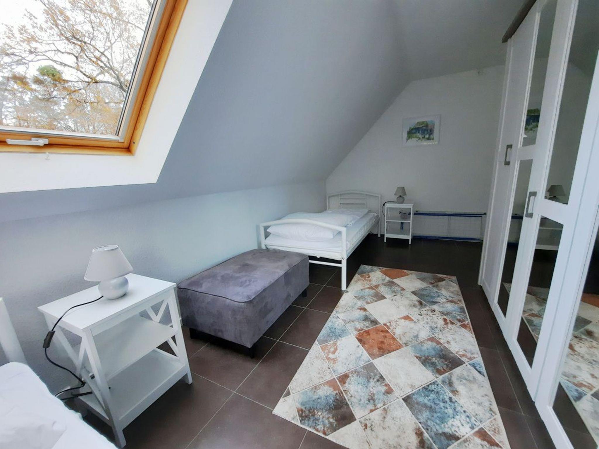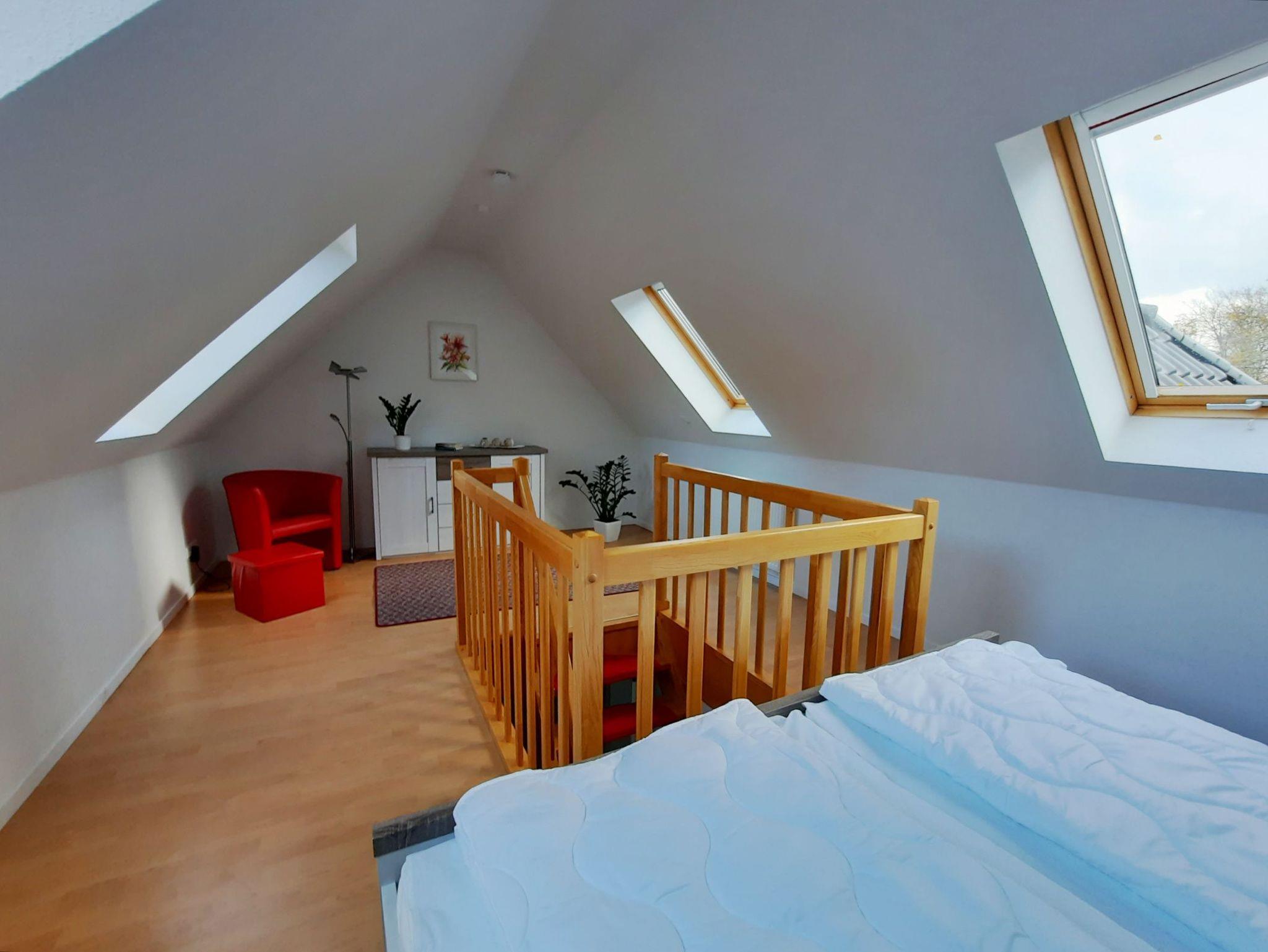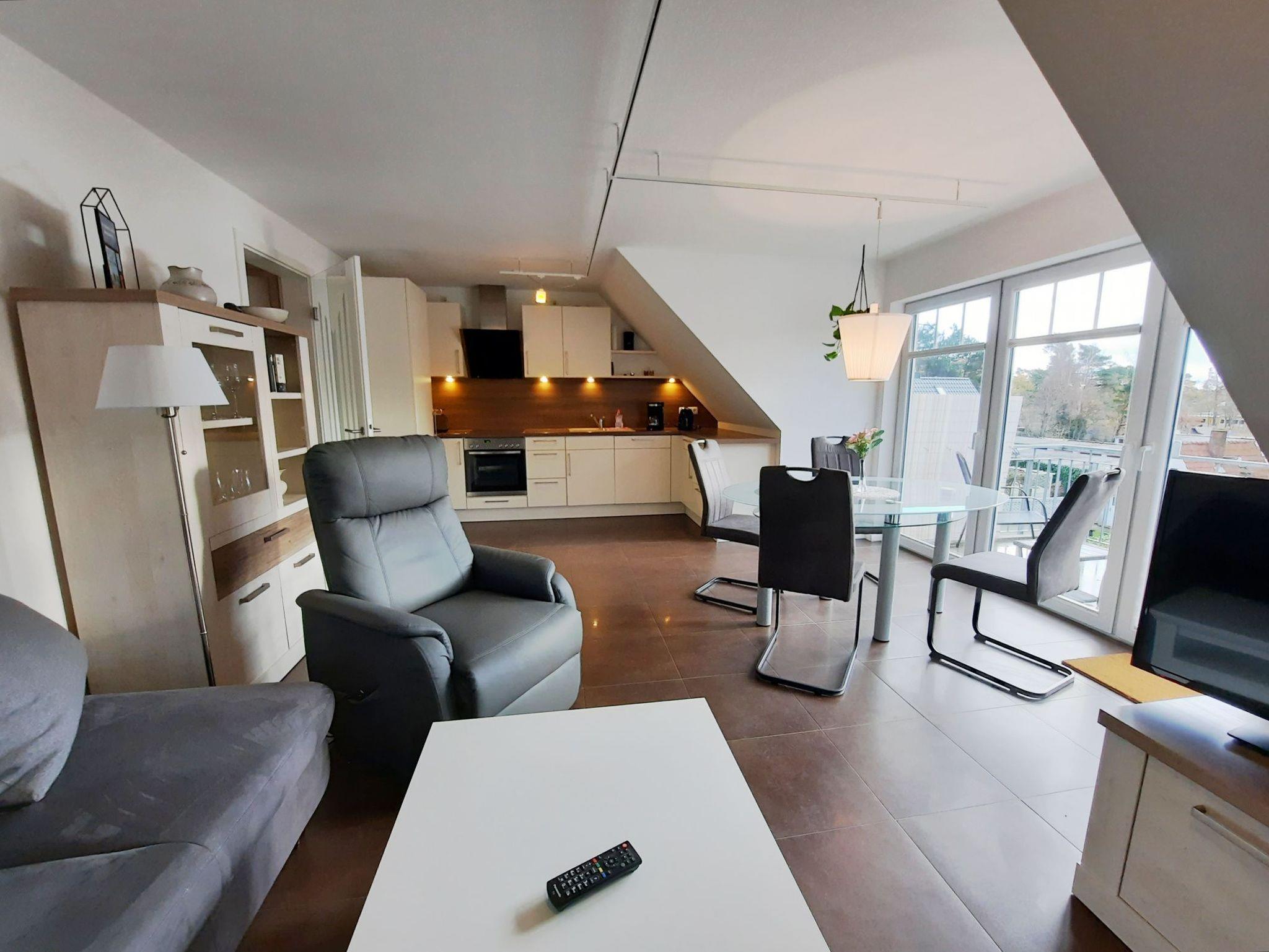 Über den Dächern vom Ostseeheilbad Graal-Müritz können Sie in dieser geräumigen 3-Zimmer-Ferienwohnung Ihren Urlaub entspannt verbringen. Die Wohnung erstreckt sich über insgesamt 65 qm und ist über 2 Ebenen verteilt. Vom Flur aus gelangen Sie in das gemütliche Wohnzimmer mit offener Küche. In der Küche befinden sich ein Geschirrspüler, eine Mikrowelle, ein Ceranfeld mit 4 Kochplatten, eine Kaffeemaschine und ein Wasserkocher. Das untere Schlafzimmer ist mit 2 Einzelbetten (jeweils 90x200 cm) und einem Kleiderschrank ausgestattet. Über eine Treppe gelangen Sie zu dem weiteren Schlafzimmer, in welchem sich ein Doppelbett (180 x 200 cm), eine Kommode und ein Sessel befinden (offene Galerie). Alle Wohn- und Schlafräume sind mit Rollos zum Abdunkeln ausgestattet. Im Bad befinden sich eine Dusche und ein WC. Vom Wohnzimmer aus können Sie auf den sonnigen, großen Balkon treten. Dieser ist für gemütilche Sonnenstunden mit Balkonmöbeln für Sie augestattet. Zu Ihrer Ferienwohnung gehören außerdem ein abschließbarer Fahrradschuppen und ein PKW-Parkplatz direkt vor dem Haus.