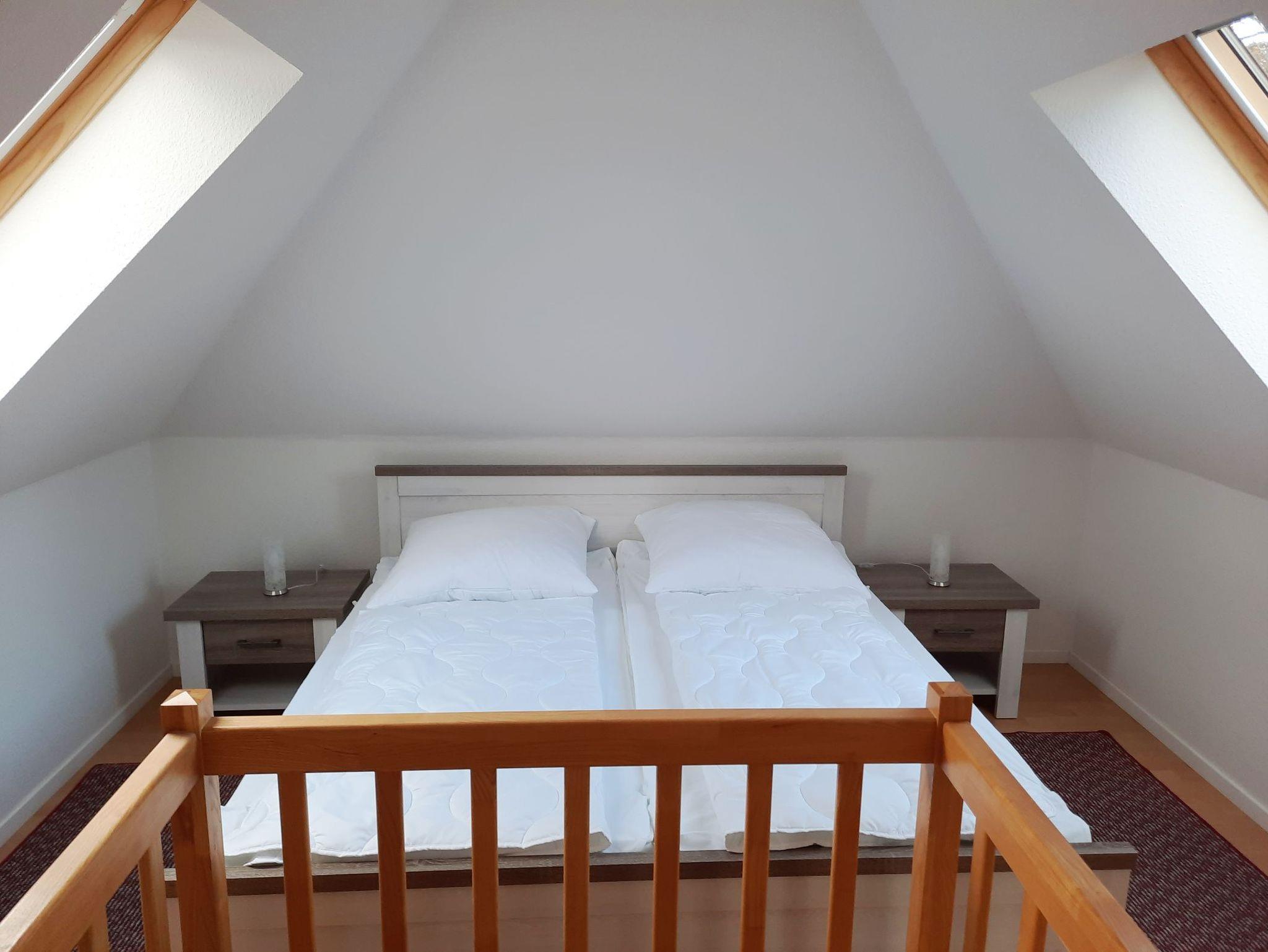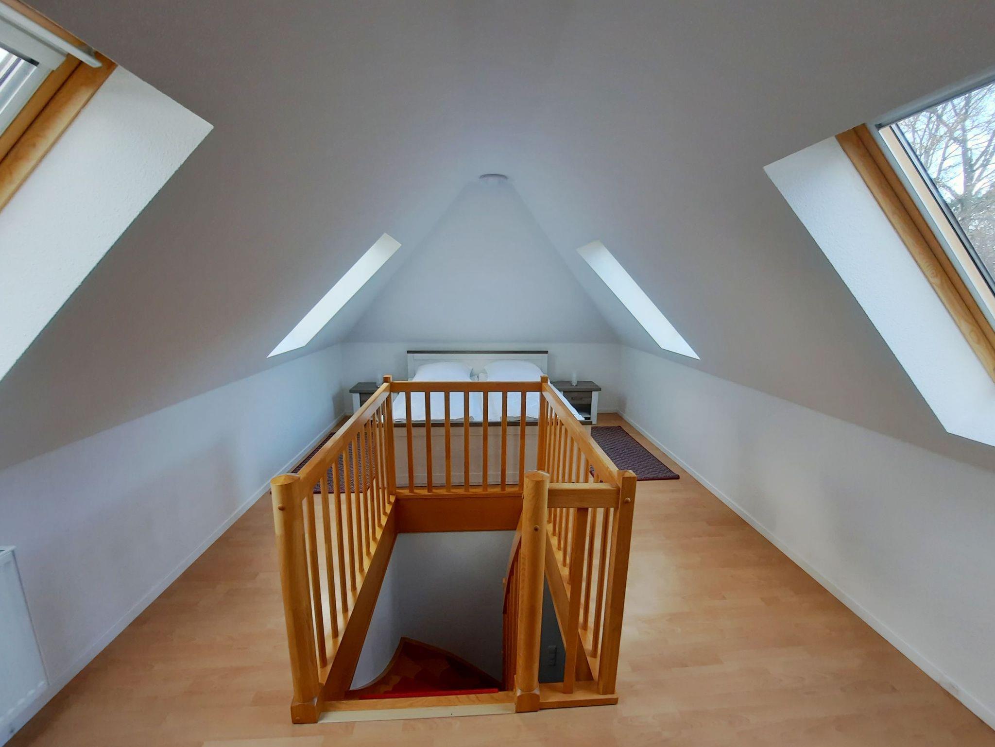 Über den Dächern vom Ostseeheilbad Graal-Müritz können Sie in dieser geräumigen 3-Zimmer-Ferienwohnung Ihren Urlaub entspannt verbringen. Die Wohnung erstreckt sich über insgesamt 65 qm und ist über 2 Ebenen verteilt. Vom Flur aus gelangen Sie in das gemütliche Wohnzimmer mit offener Küche. In der Küche befinden sich ein Geschirrspüler, eine Mikrowelle, ein Ceranfeld mit 4 Kochplatten, eine Kaffeemaschine und ein Wasserkocher. Das untere Schlafzimmer ist mit 2 Einzelbetten (jeweils 90x200 cm) und einem Kleiderschrank ausgestattet. Über eine Treppe gelangen Sie zu dem weiteren Schlafzimmer, in welchem sich ein Doppelbett (180x200 cm), eine Kommode und ein Sessel befinden (offene Galerie). Alle Wohn- und Schlafräume sind mit Rollos zum Abdunkeln ausgestattet. Im Bad befinden sich eine Dusche und ein WC. Vom Wohnzimmer aus können Sie auf den sonnigen, großen Balkon treten. Dieser ist für gemütilche Sonnenstunden mit Balkonmöbeln für Sie augestattet. Zu Ihrer Ferienwohnung gehören außerdem ein abschließbarer Fahrradschuppen und ein PKW-Parkplatz direkt vor dem Haus.
