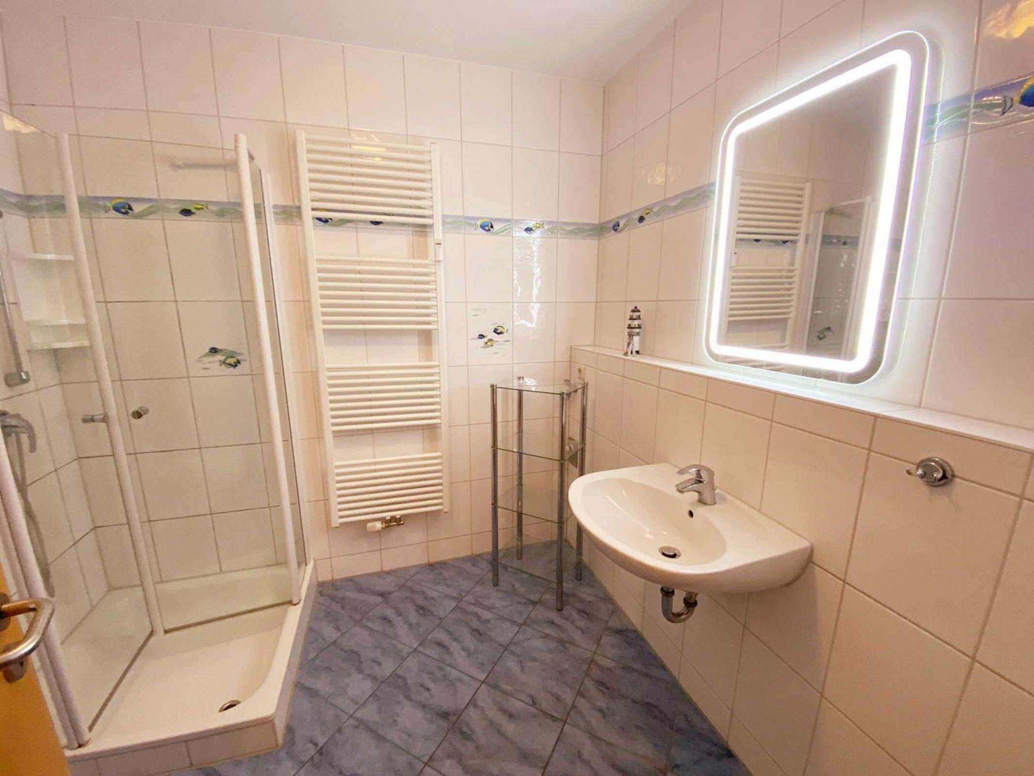• Bad: ohne Fenster, Dusche, Waschbecken, Toilette, Spiegel, Regal, Handtuchhaken
