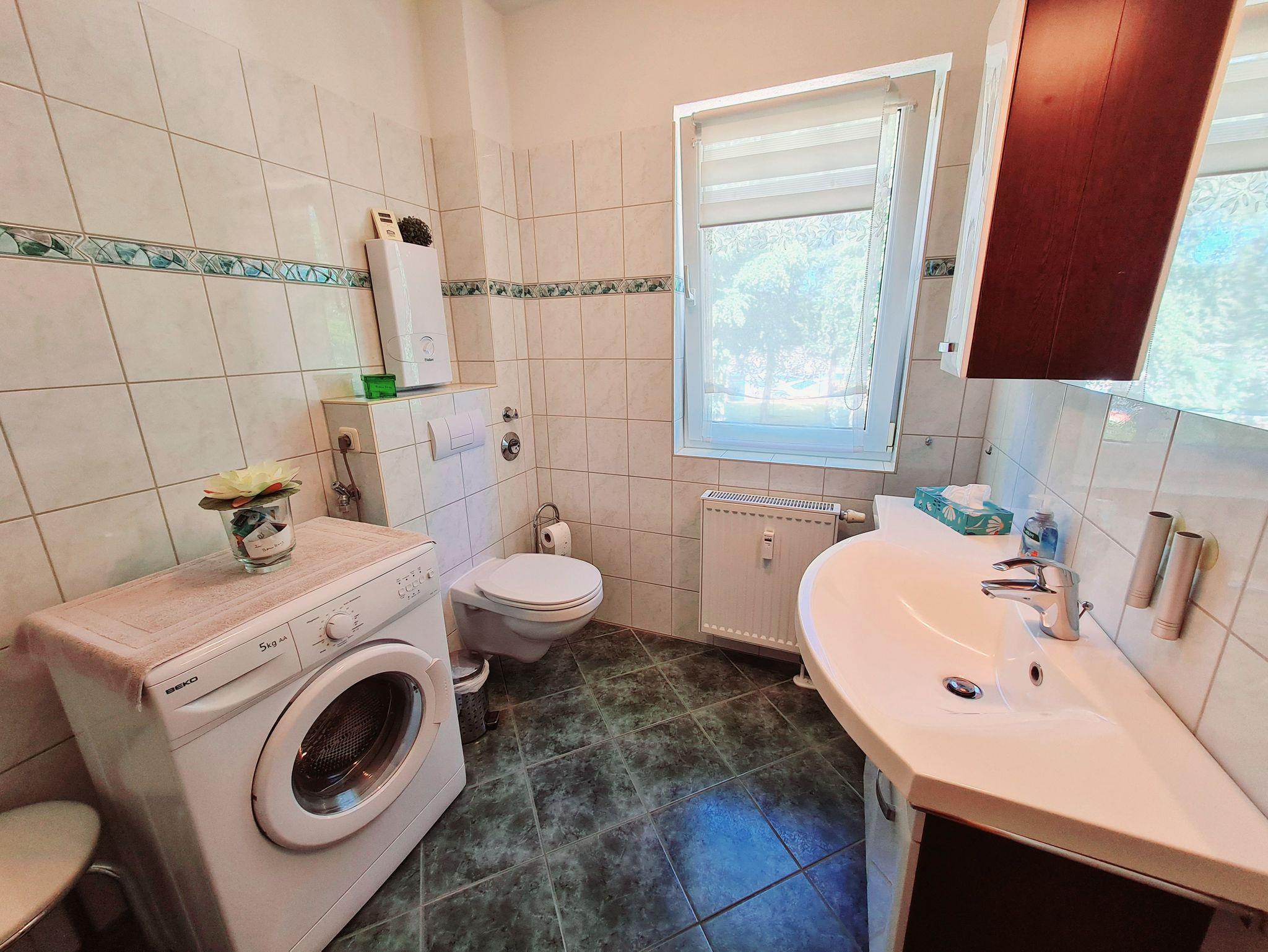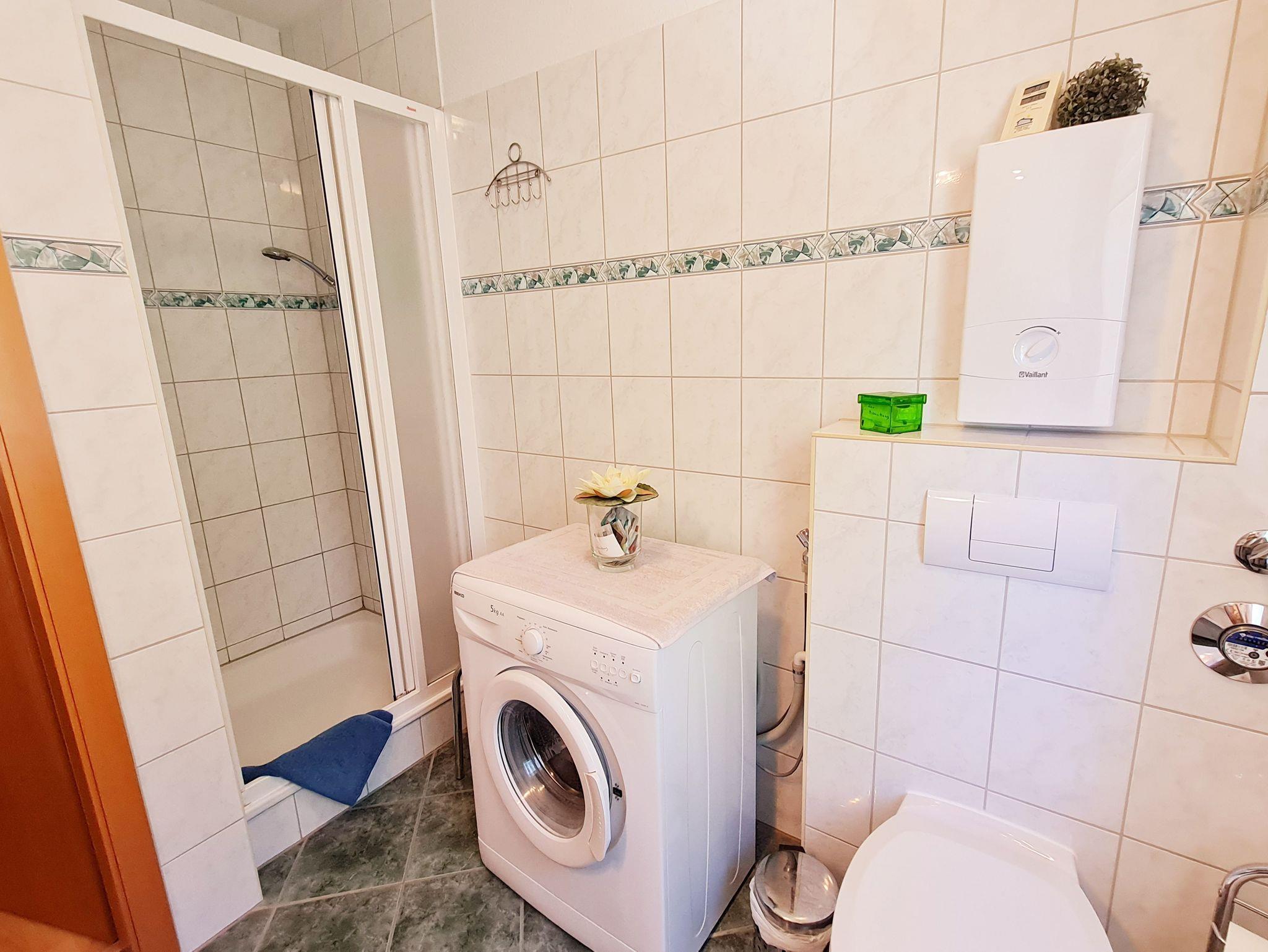 • Bad: mit Fenster, Dusche, Waschbecken, Toilette, Spiegelschrank, Waschbeckenunterschrank, Waschmaschine, Fön