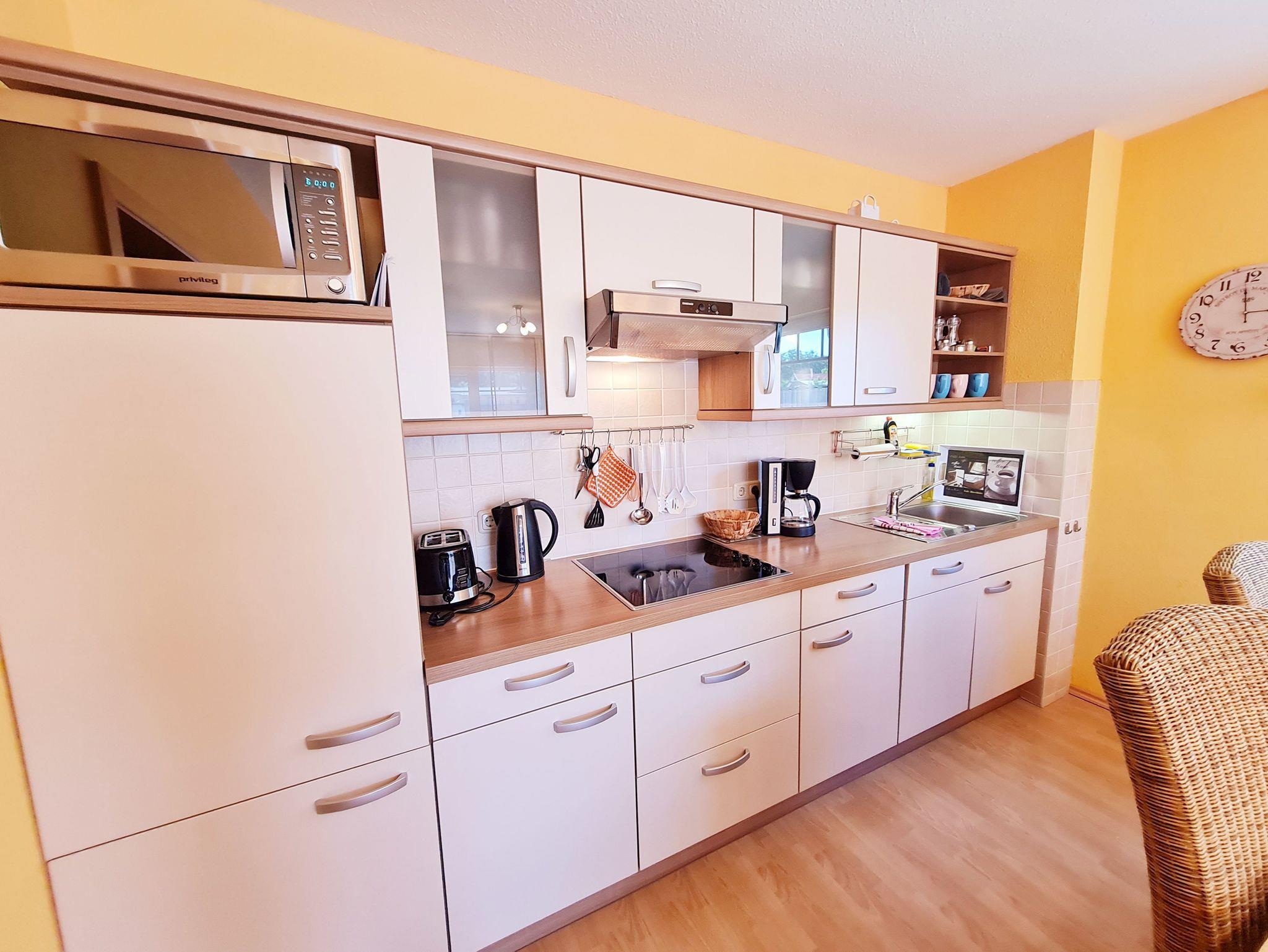 • Küche und Essbereich für 4 Personen offen zum Wohnzimmer, komplett eingerichtete Einbauküche mit Ceranfeld, Toaster, Kaffeemaschine, Wasserkocher, Kühlschrank mit Eisfach, Mikrowelle mit Heißluft und Grill, Geschirrspüler