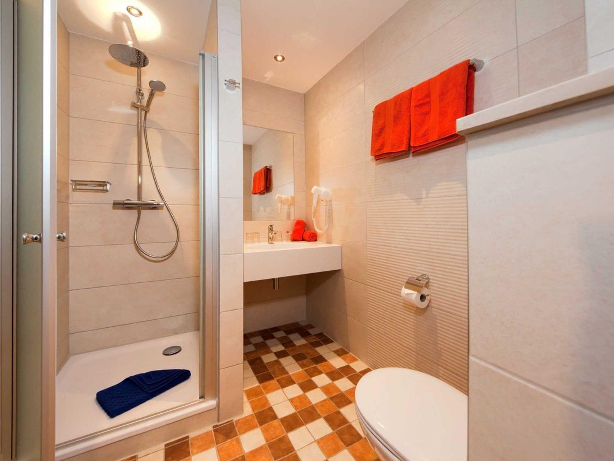 Das Bad ist ausgestattet mit Dusche, Waschtisch, WC, Handtuchheizkörper und Föhn.