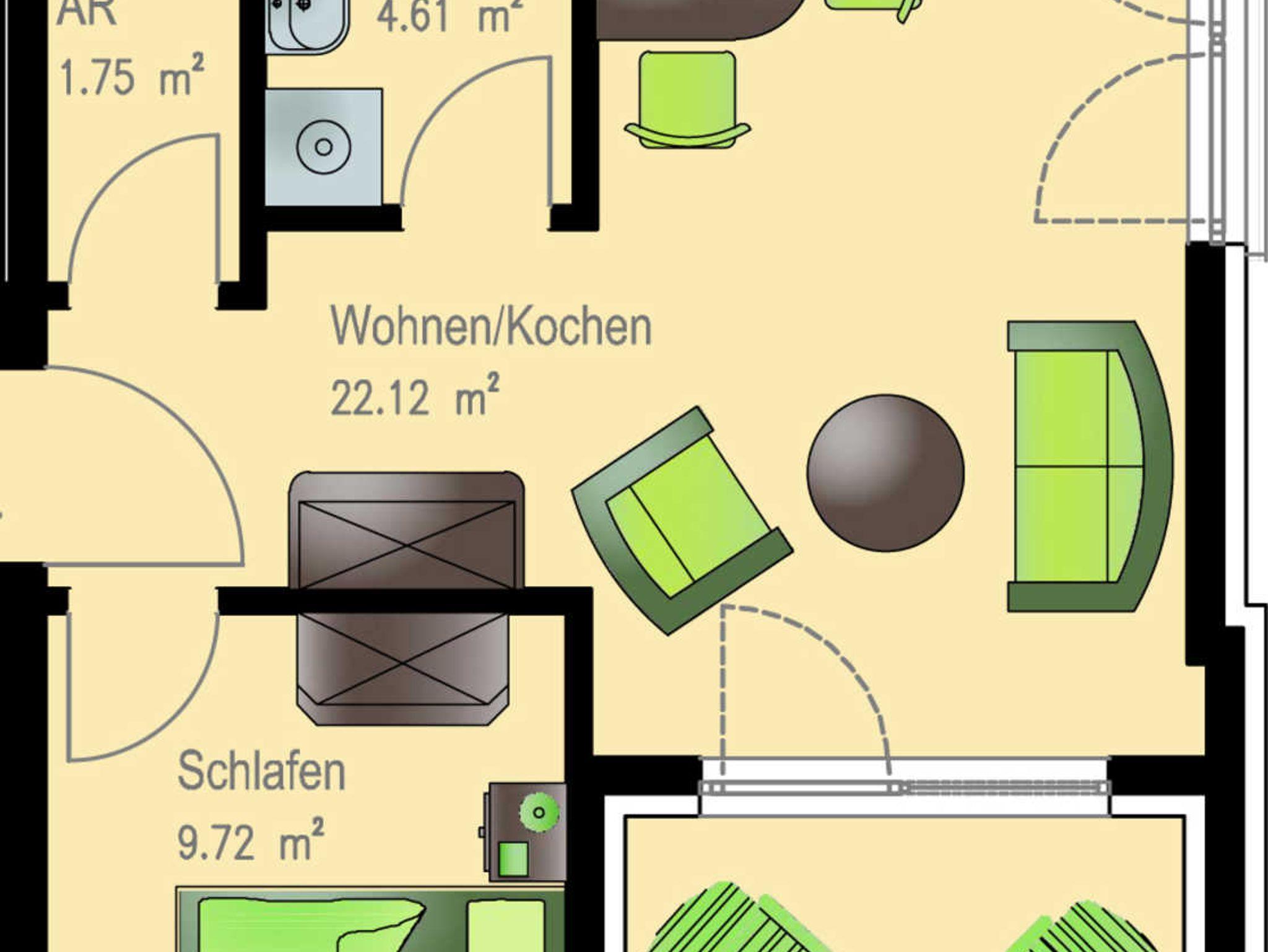 • Wohnzimmer: gemütliche Schlafcouch Textil (150x200), Sessel, TV-Flachbild, TV-Bank, Tisch, direkter Zugang zum Südbalkon