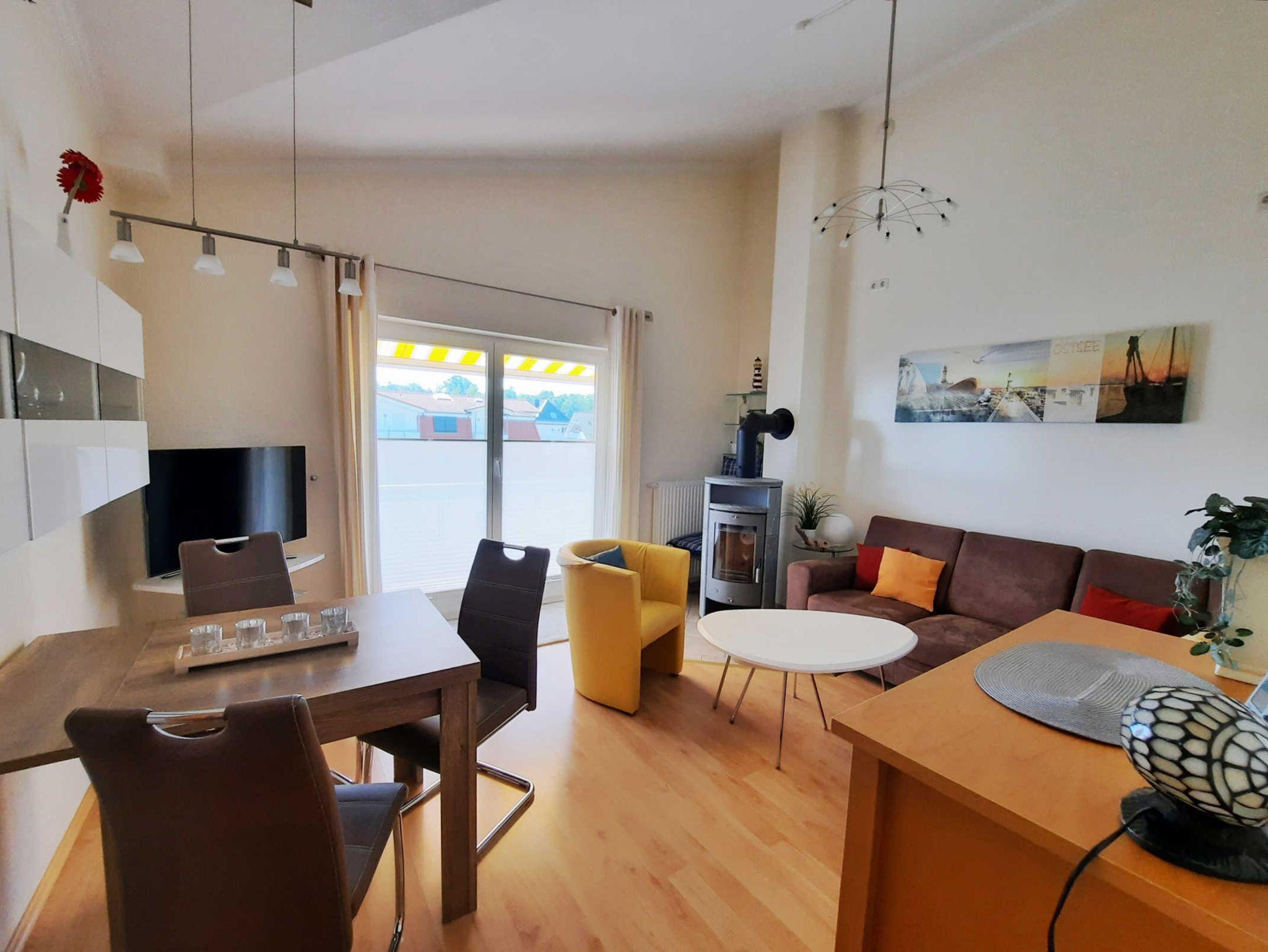 Diese 3-Zimmer-Ferienwohnung im Ortsteil Müritz besticht durch 2 Balkone. Einen Nord- und einen Südbalkon, sodass Sie zu jeder Tageszeit die Sonne draußen genießen können. Sollte es Ihnen doch einmal zu sonnig sein, wählen Sie den für sich passenden Balkon, oder fahren Sie die Markise aus. Andernfalls sorgen elektrische Rollläden in der gesamten Wohnung für angenehme Kühle und Abdunklung. Die Faltplissees sorgen in der Wohnung für Ihre Behaglichkeit und Sichtschutz. Für die kühlere Jahreszeit steht Ihnen im Wohnzimmer ein Kamin zur Verfügung, außerdem befinden sich dort eine Couch sowie eine Ess-Ecke. Ausgestattet mit Flachbild-Fernseher und einer HiFi-Anlage mit CD-Player. Im Wohn- und einem Schlafzimmer sind die Raumdecken außergewöhnlich schön angeordnet. Als besonderes Highlight dieser Ferienwohnung sind in diesen Räumen die Raumhöhen ca. 4,20 Meter und fallen bis auf eine Höhe von ca. 2,60 Meter.
