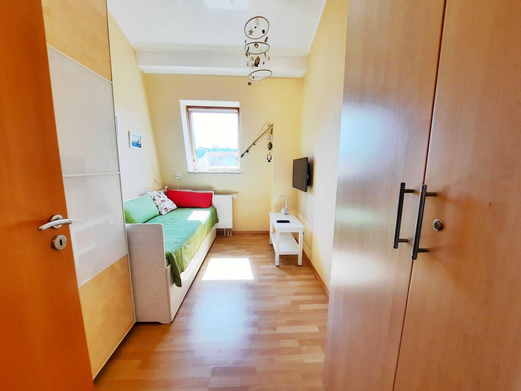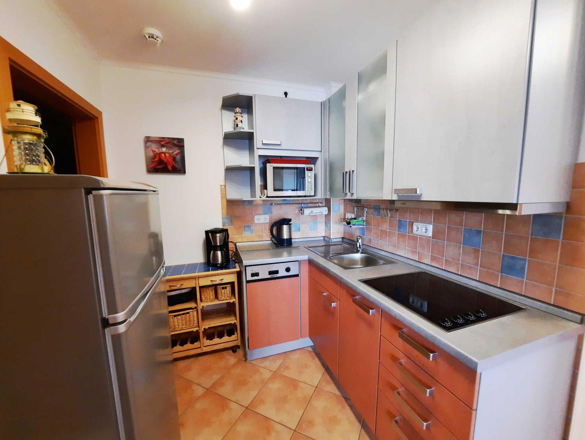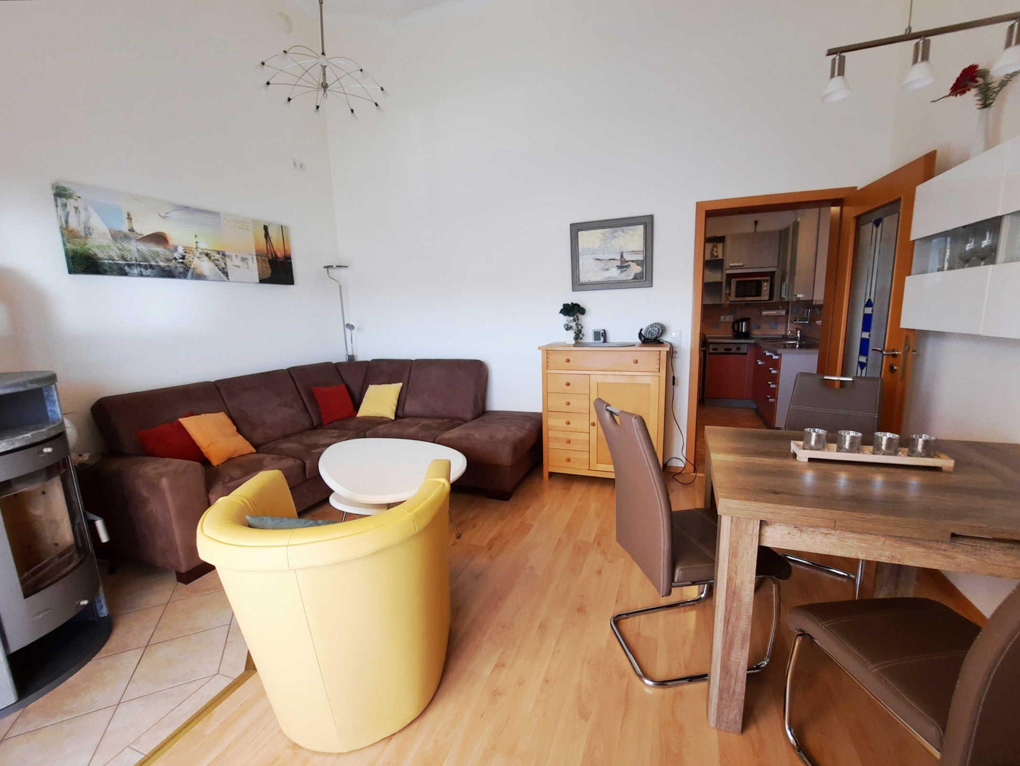 Die Ferienwohnung verfügt über ein Wohnzimmer mit Couch und Fernseher, eine Küchenzeile mit Geschirrspüler, Kühlschrank und Cerankochfeld, zwei Schlafzimmer (eines mit Doppelbett und eines mit einem Tandembett) sowie über ein Bad mit Dusche, WC, Waschmaschine und Waschtisch.