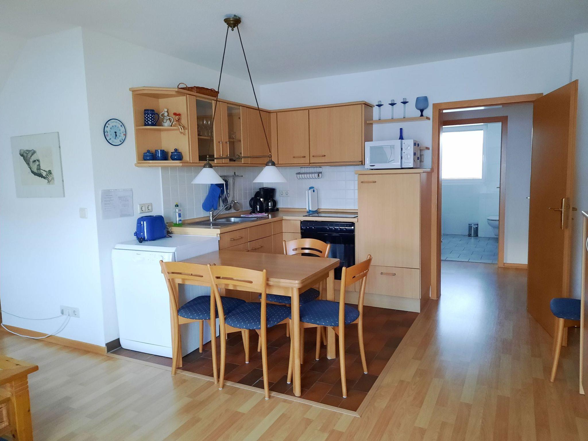 Die in das gemütliche Wohnzimmer integrierte Küche mit Essecke ist komplett ausgetattet unter anderem mit einem Herd (4 Platten), einer Backröhre, einem Kühlschrank, einer Mikrowelle, einer Kaffeemaschine und einem Wasserkocher.