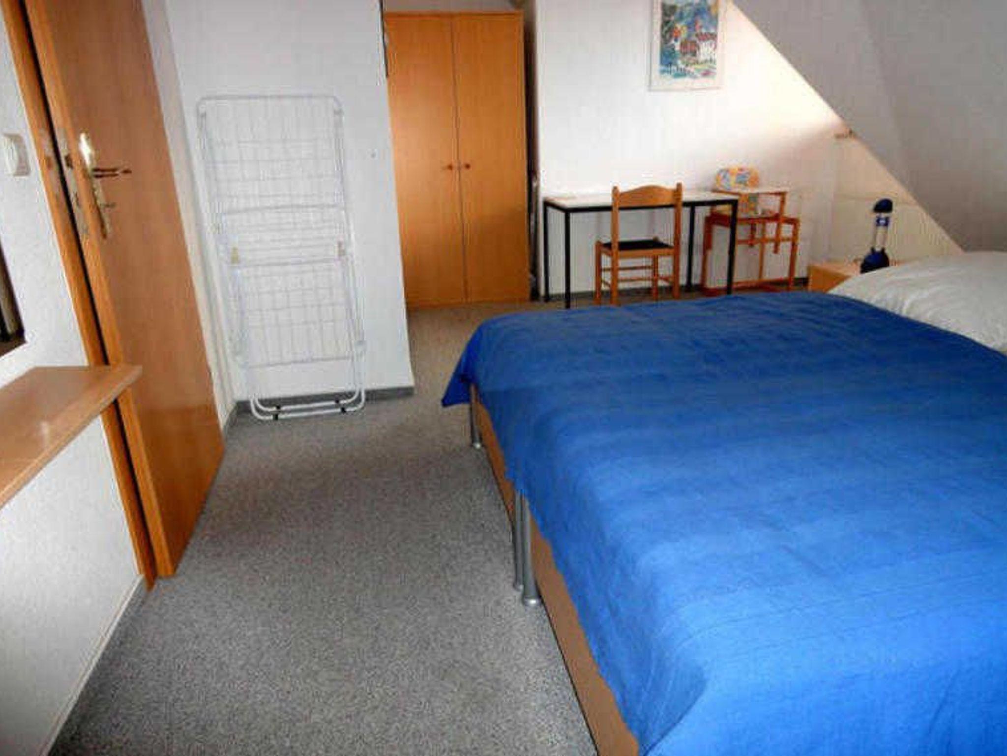In dem Schlafzimmer stehen 2 Einzelbetten (nebeneinander), ein Kleiderschrank und ein Arbeitstisch.
