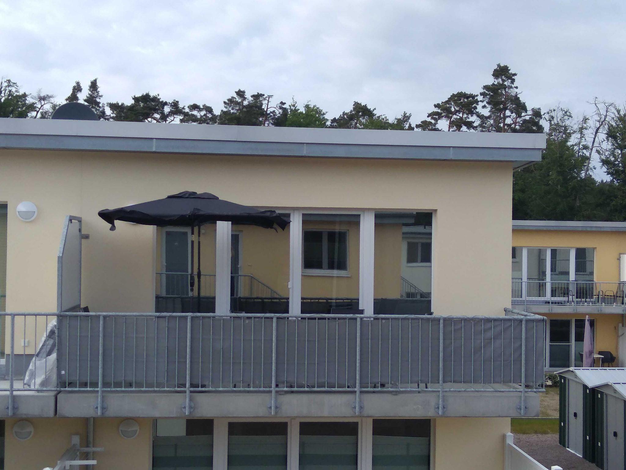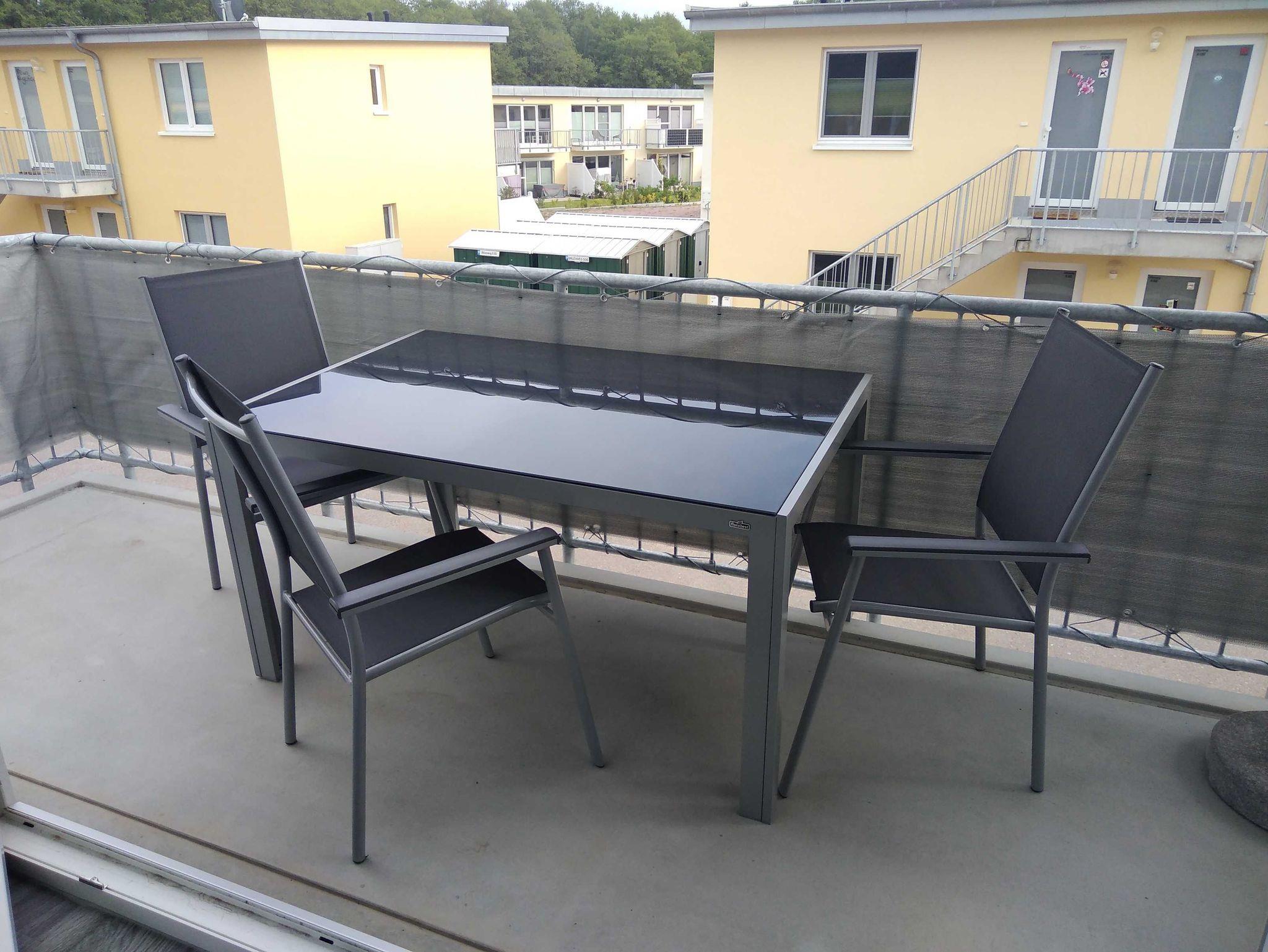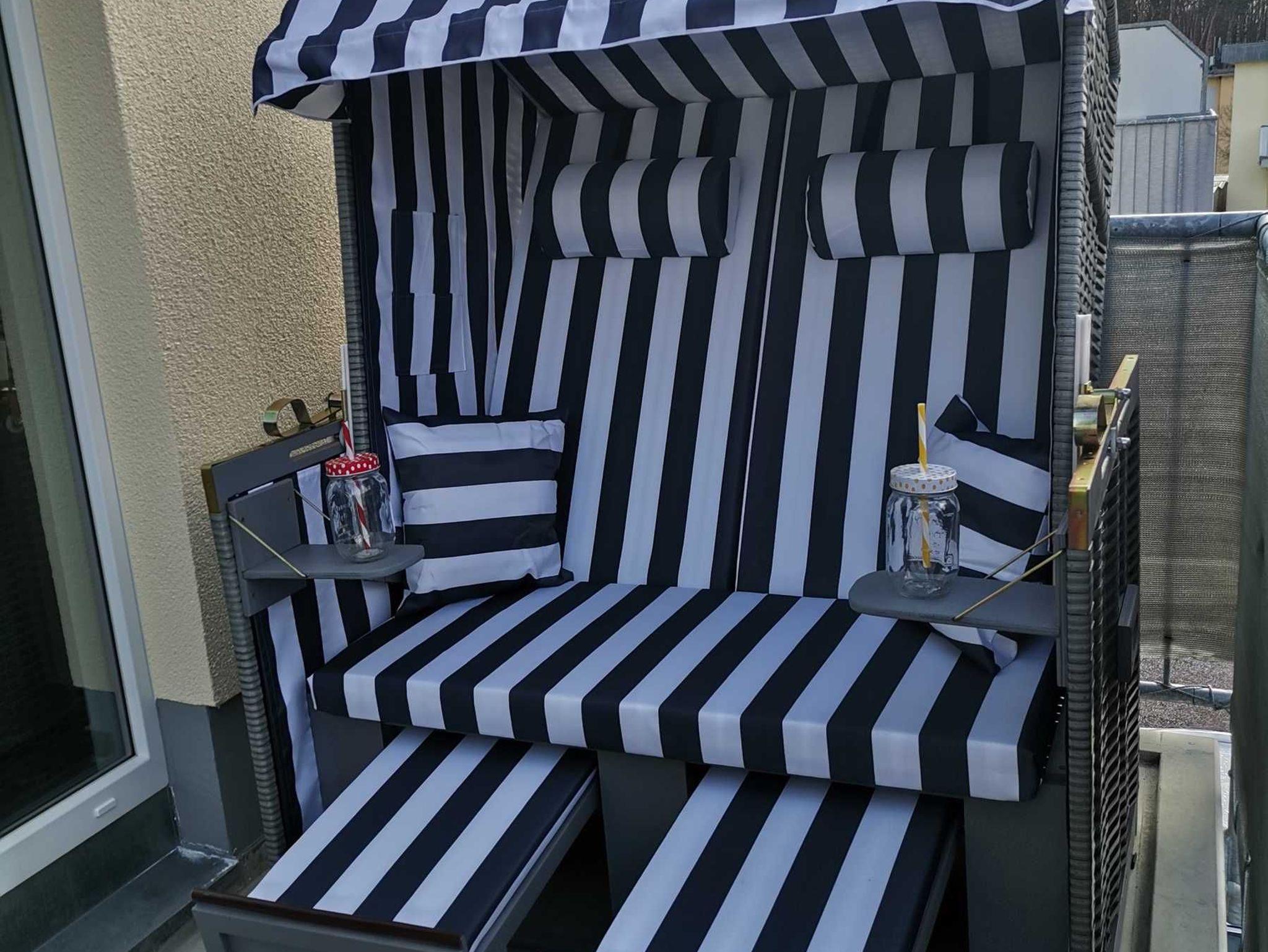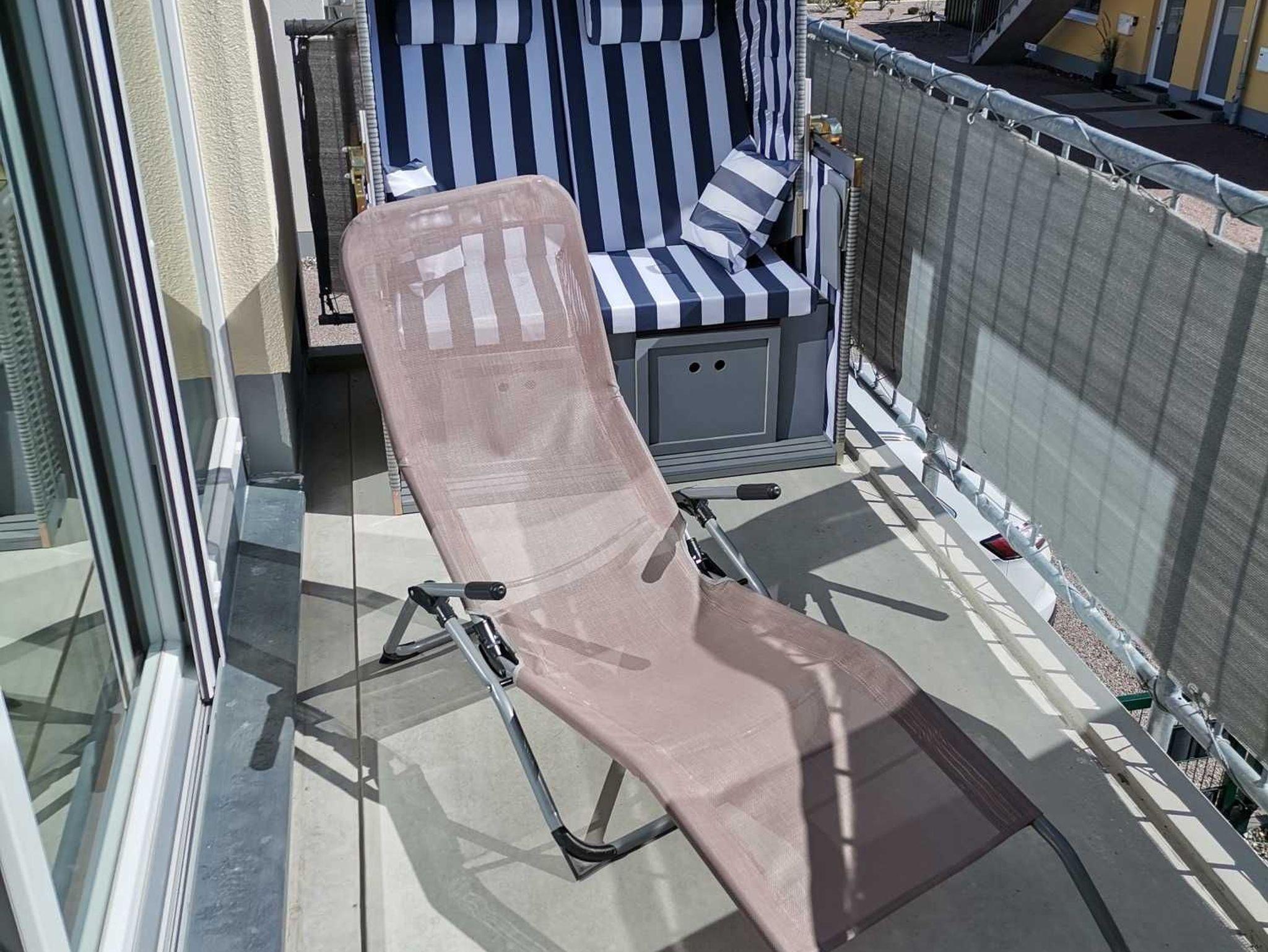 Der Balkon ist mit einem Tisch und 4 Stühle, einen Sonnenschirm und einen Strandkorb ausgestattet, dass Sie die Sonne auch auf dem Balkon genießen können.