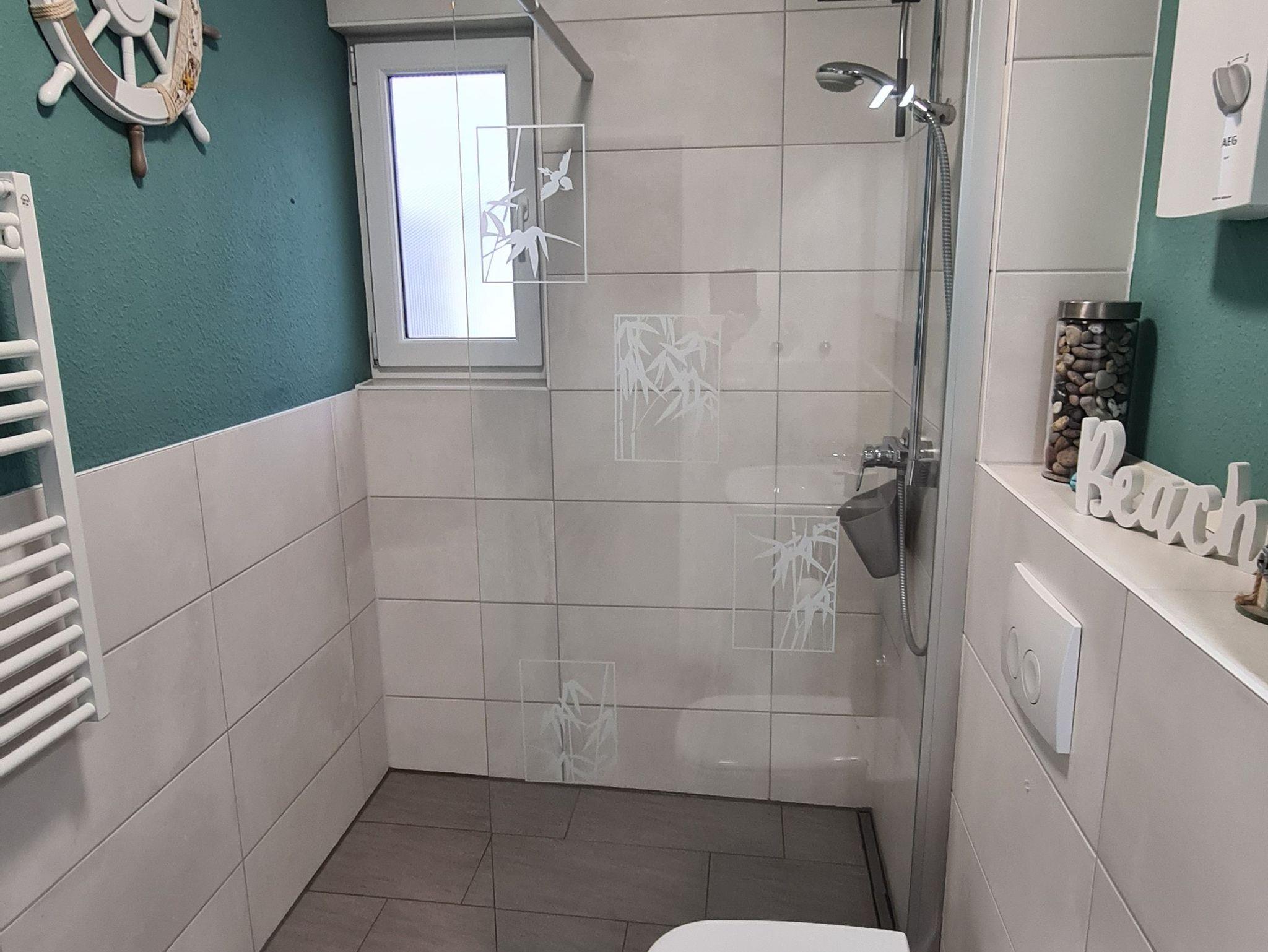 Im Bad gibt hat eine begehbare Dusche, ein Spiegelschrank und einen Handtuchtrockner.