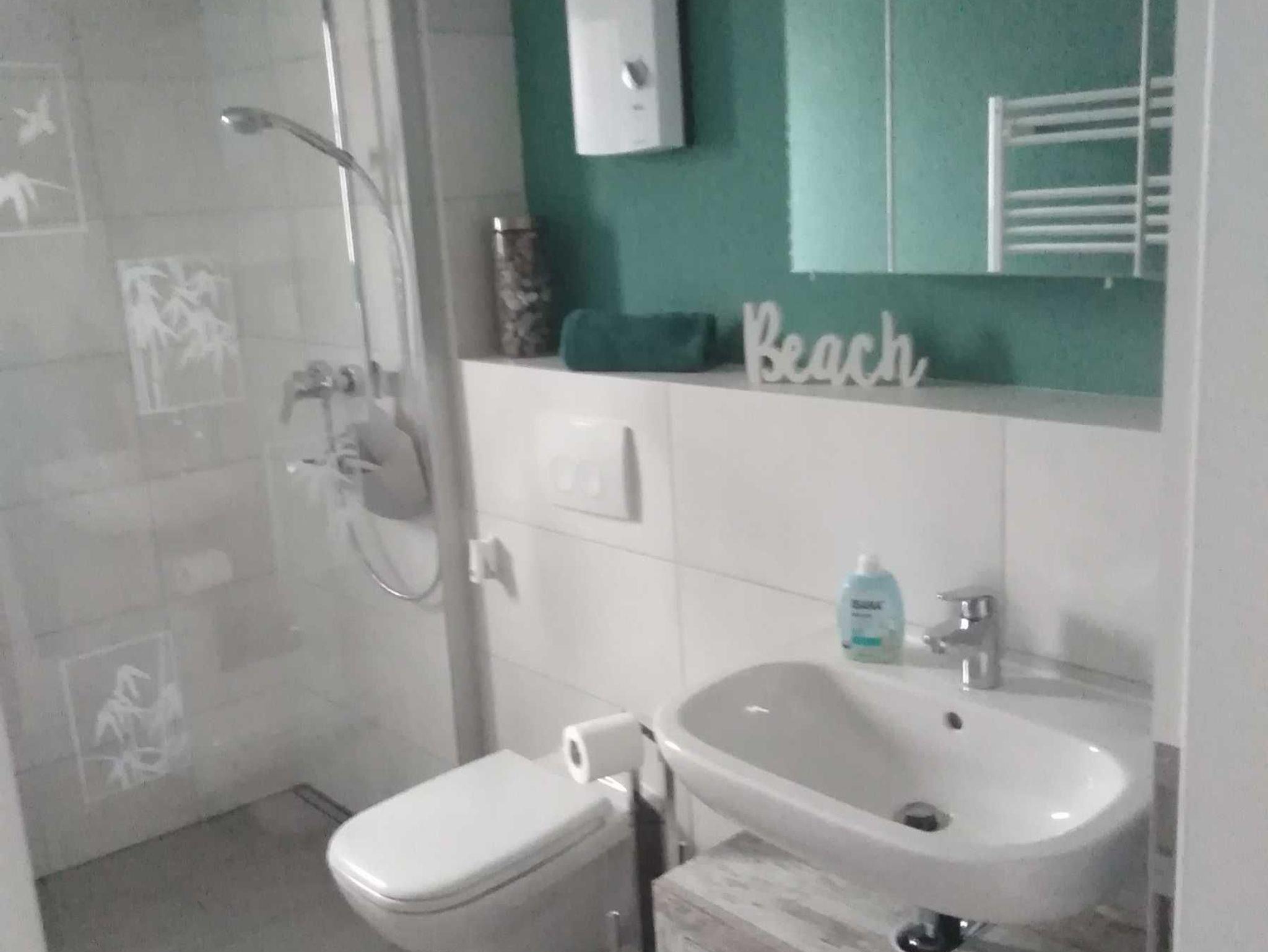 Im Bad gibt hat eine begehbare Dusche, ein Spiegelschrank und einen