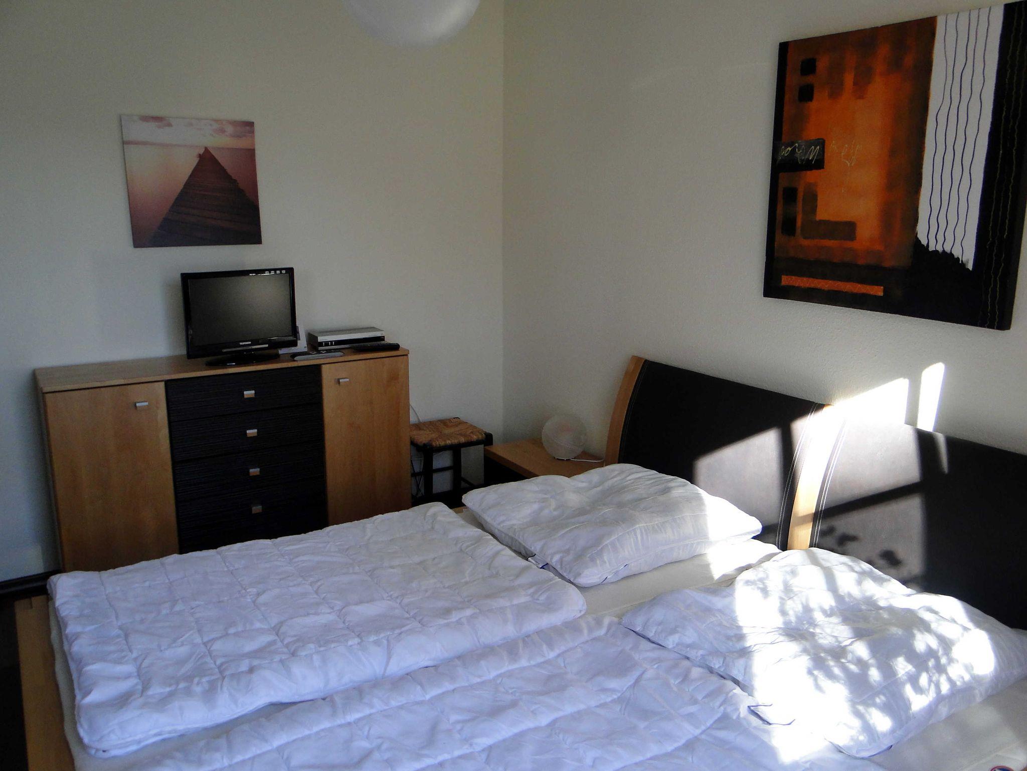 Ein geräumiger Kleiderschrank mit Bügeln und eine Kommode sorgen im Schlafzimmer dafür, dass Sie Ihre Garderobe immer aufgeräumt vorfinden, wenn Sie morgens im bequemen Doppelbett erwachen. Hier gibt es auch einen modernen Flachbildschirm.
