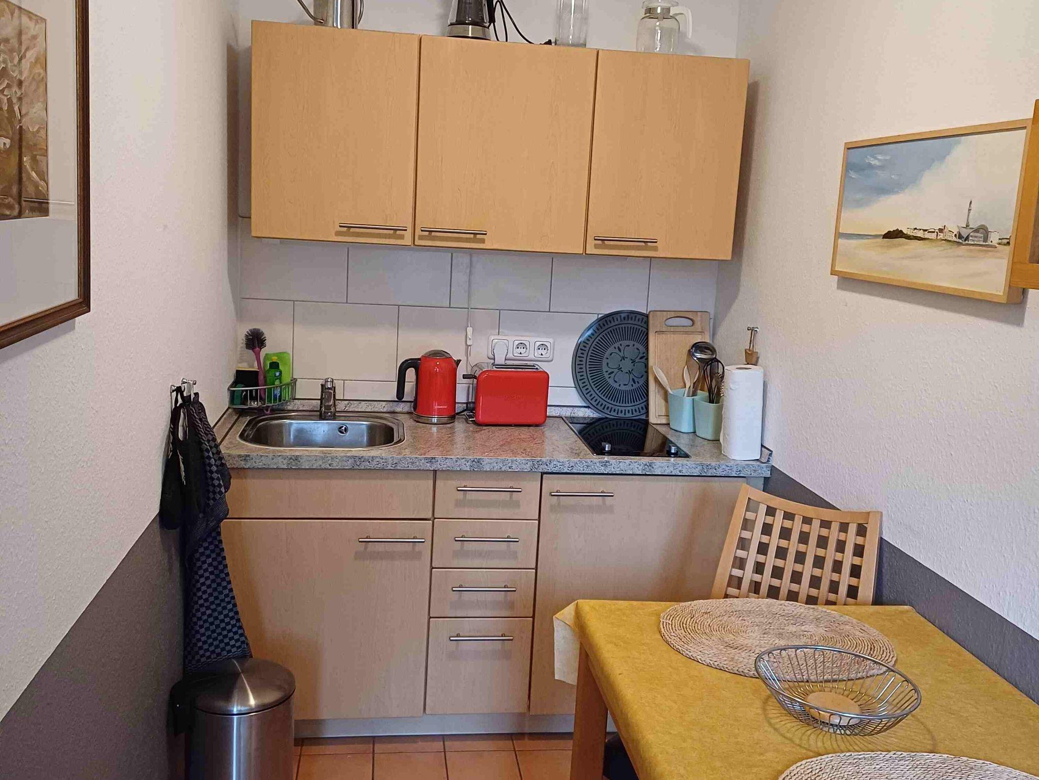 Die Küchenzeile ist mit einem Zweiplattenkocher ( Ceranfeld), Kühlschrank mit Gefrierfach, Toaster, Kaffeemaschine und Wasserkocher ausgestattet. Im Außenbereich steht Ihnen ein Grill, Sonnenschirm, Tisch und Stühle mit Auflagen zur Verfügung. Sie können dort separat und in Ruhe verweilen umgeben von grüner Hecke und Bepflanzungen.