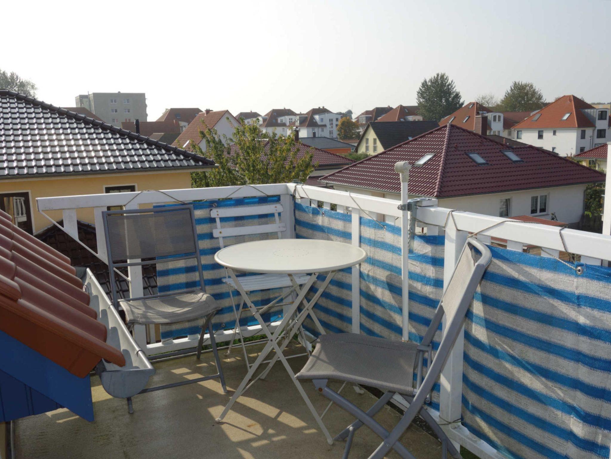 Zur Ferienwohnung gehören ein Balkon in Südwestlage mit Balkonmöbeln, ein der Wohnung zugeordneter PKW-Stellplatz auf dem Grundstück und ein abschließbarer Schuppen für Fahrräder und Strandutensilien.