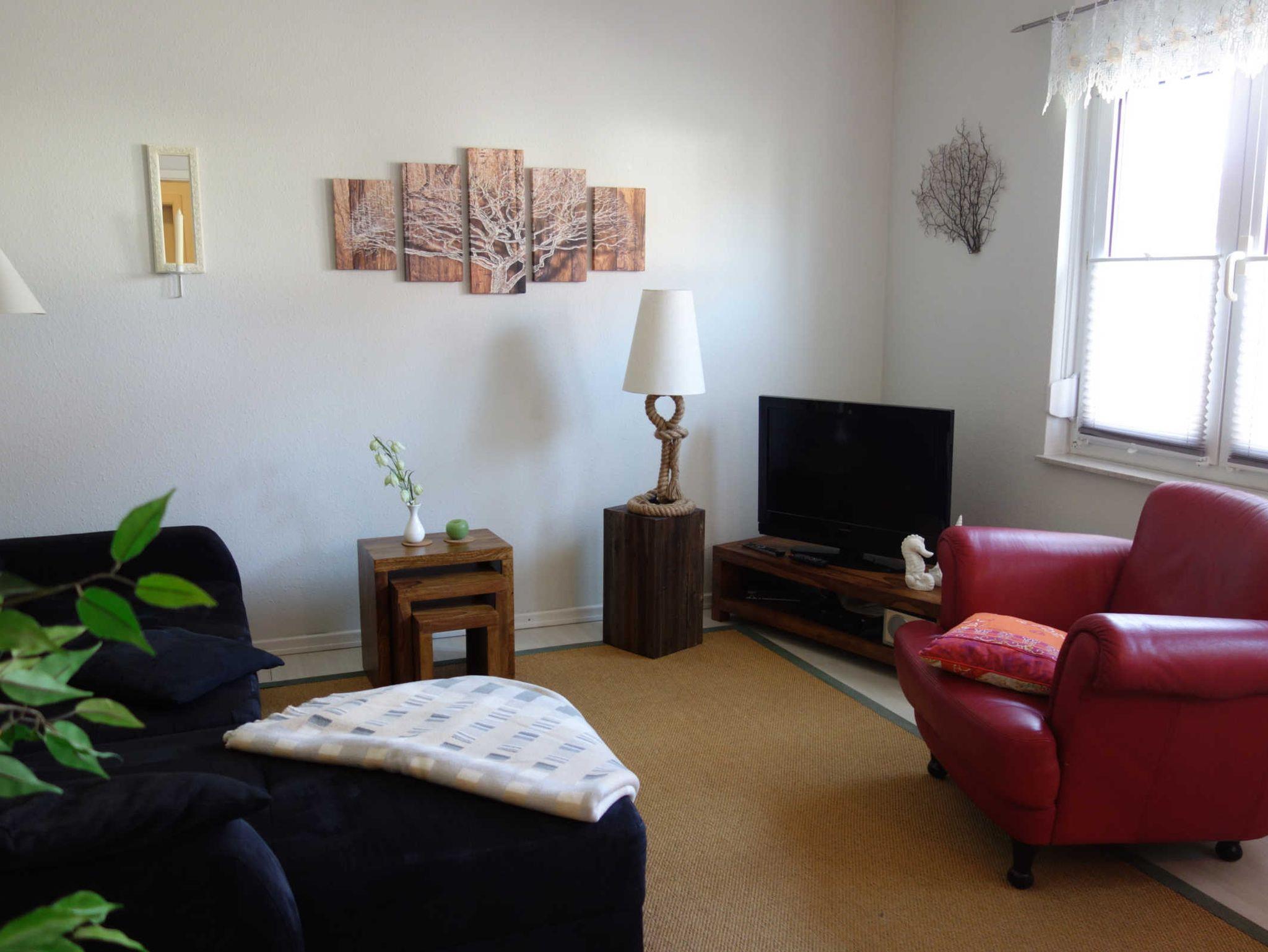 Die 2 Zimmer Ferienwohnung befindet sich im Erdgeschoss und verfügt über ein Wohnzimmer mit einer Couch und einem Fernseher, eine Küche mit Backofen und Kühlschrank und ein Bad mit Dusche und WC. Zu der Ferienwohnung gehört außerdem ein PKW-Stellplatz.