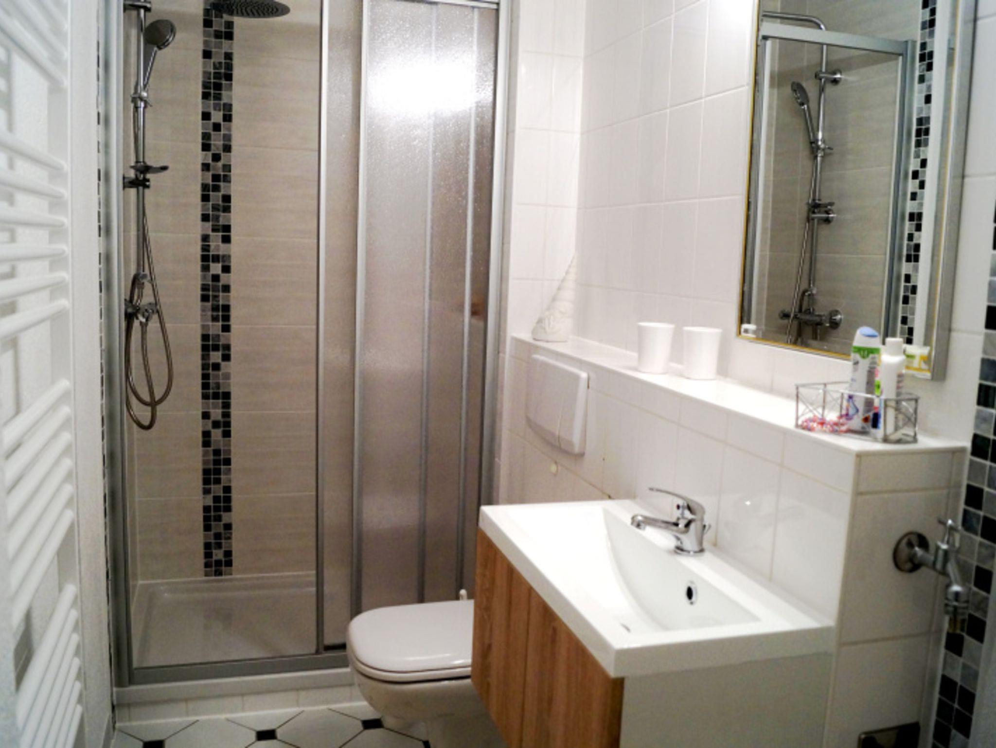 Das geflieste Bad hat eine Dusche und ein WC.