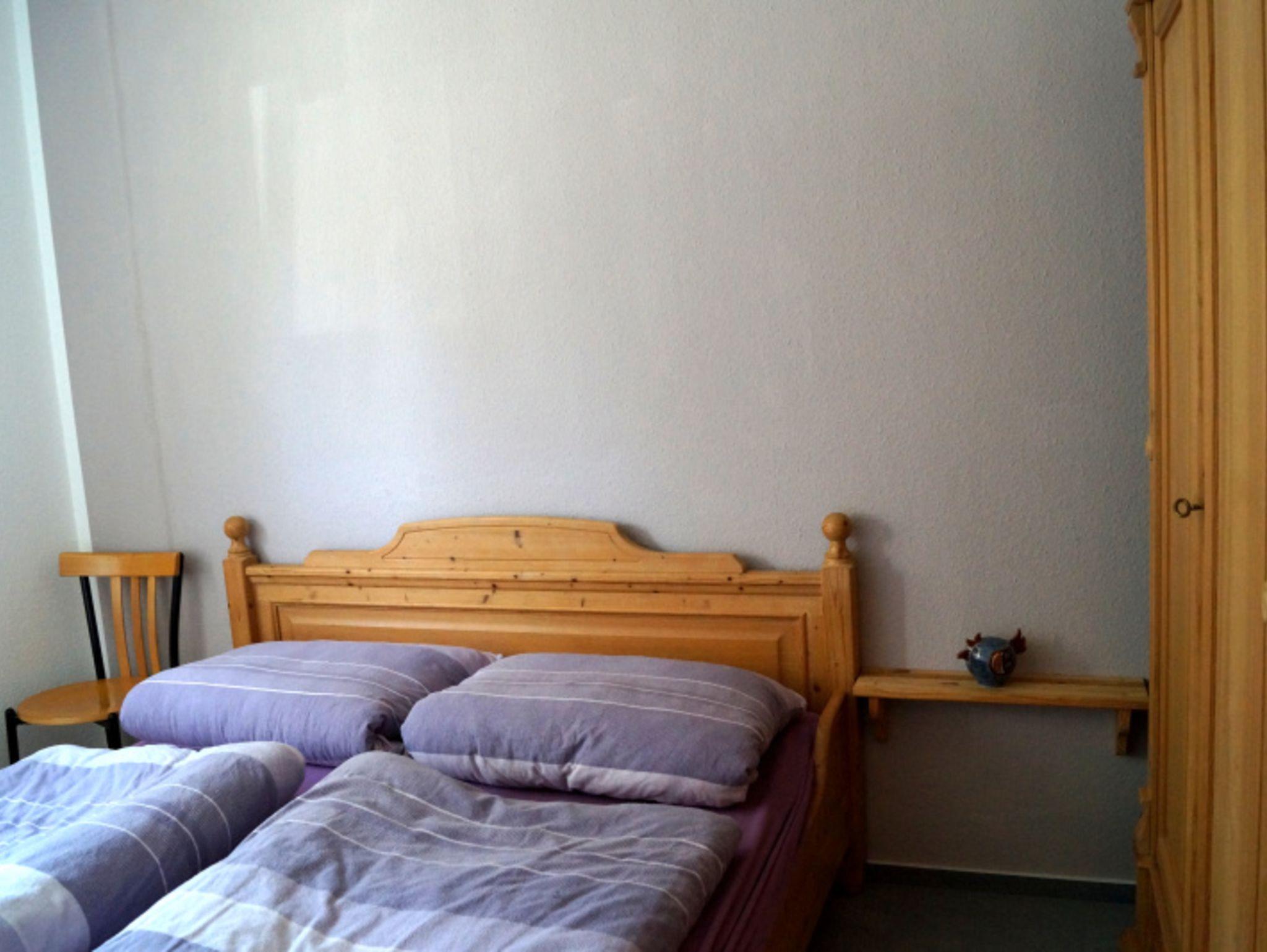 Das Schlafzimmer verfügt über ein Doppelbett und einen Kleiderschrank.