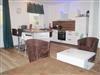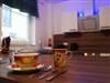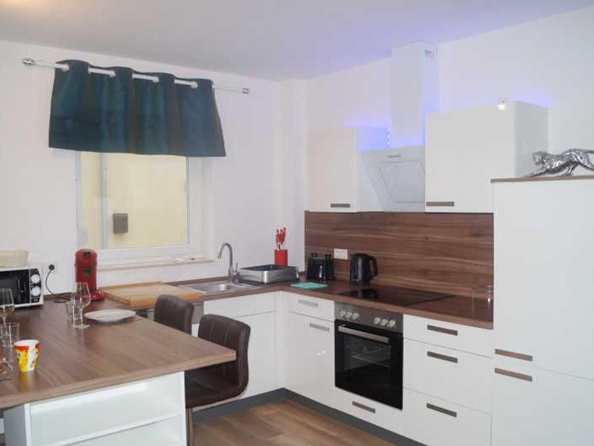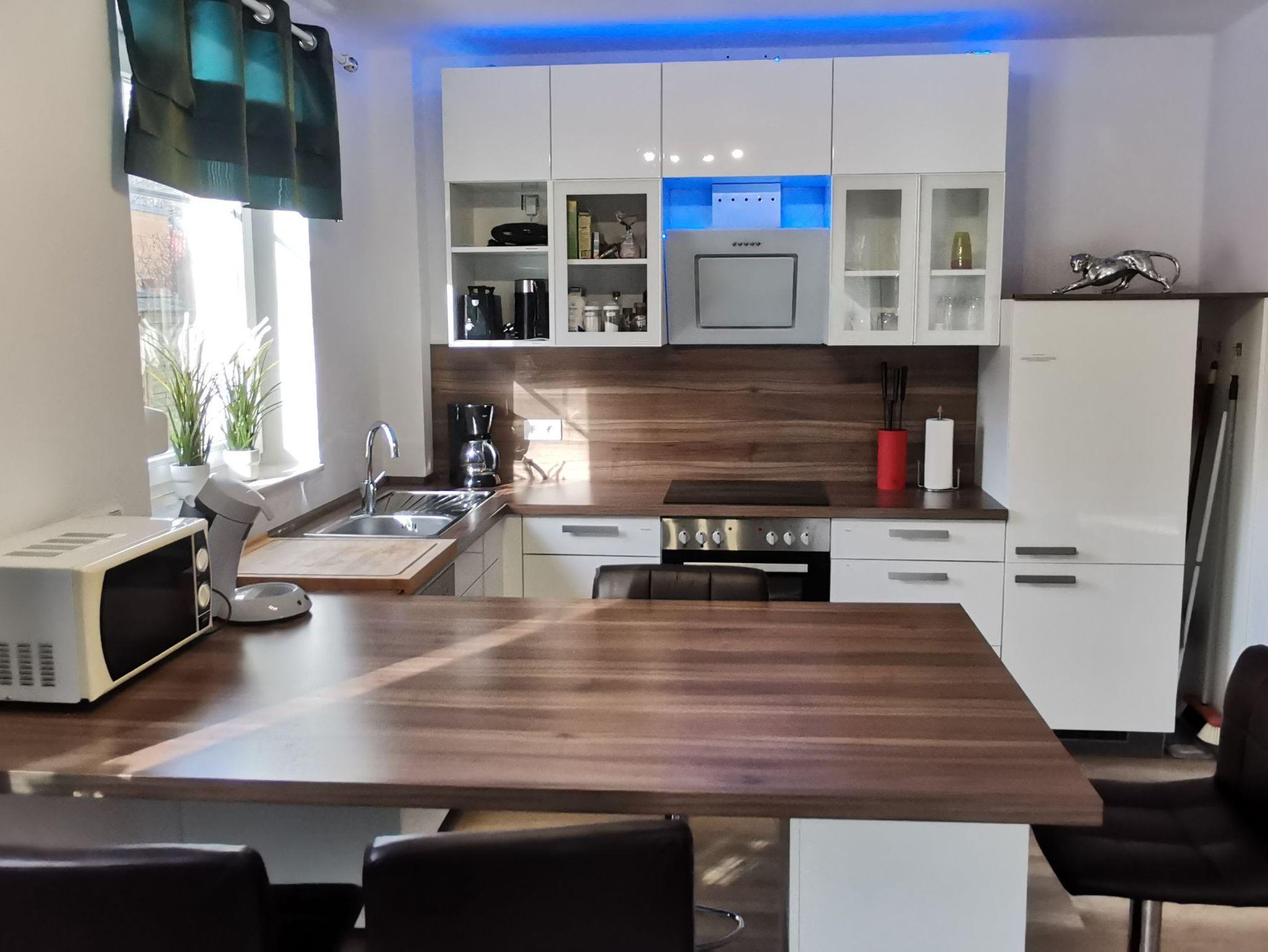 Die offene Küche ist in das Wohnzimmer integriert und ist unter anderem mit 4 Ceranfeldern, einer Backröhre, einer Geschirrspülmaschine, einem Kühlschrank, einer Mikrowelle, einem Sandwich-Toaster, einem Wasserkocher und einem Toaster sowie einer Senseo Kaffeemaschine ausgestattet.