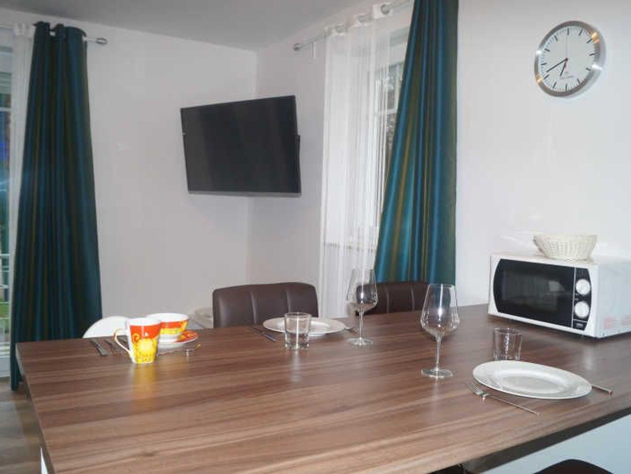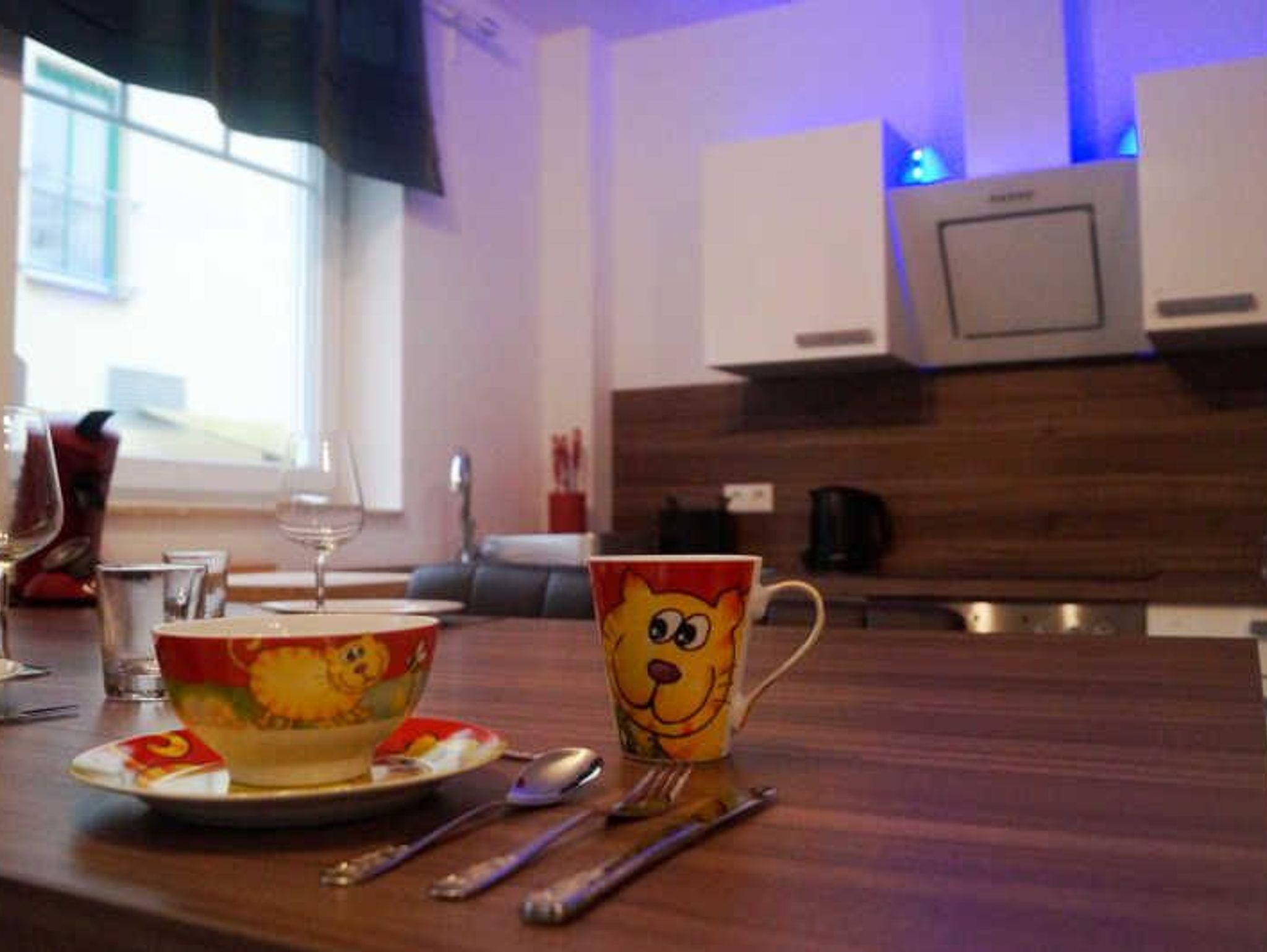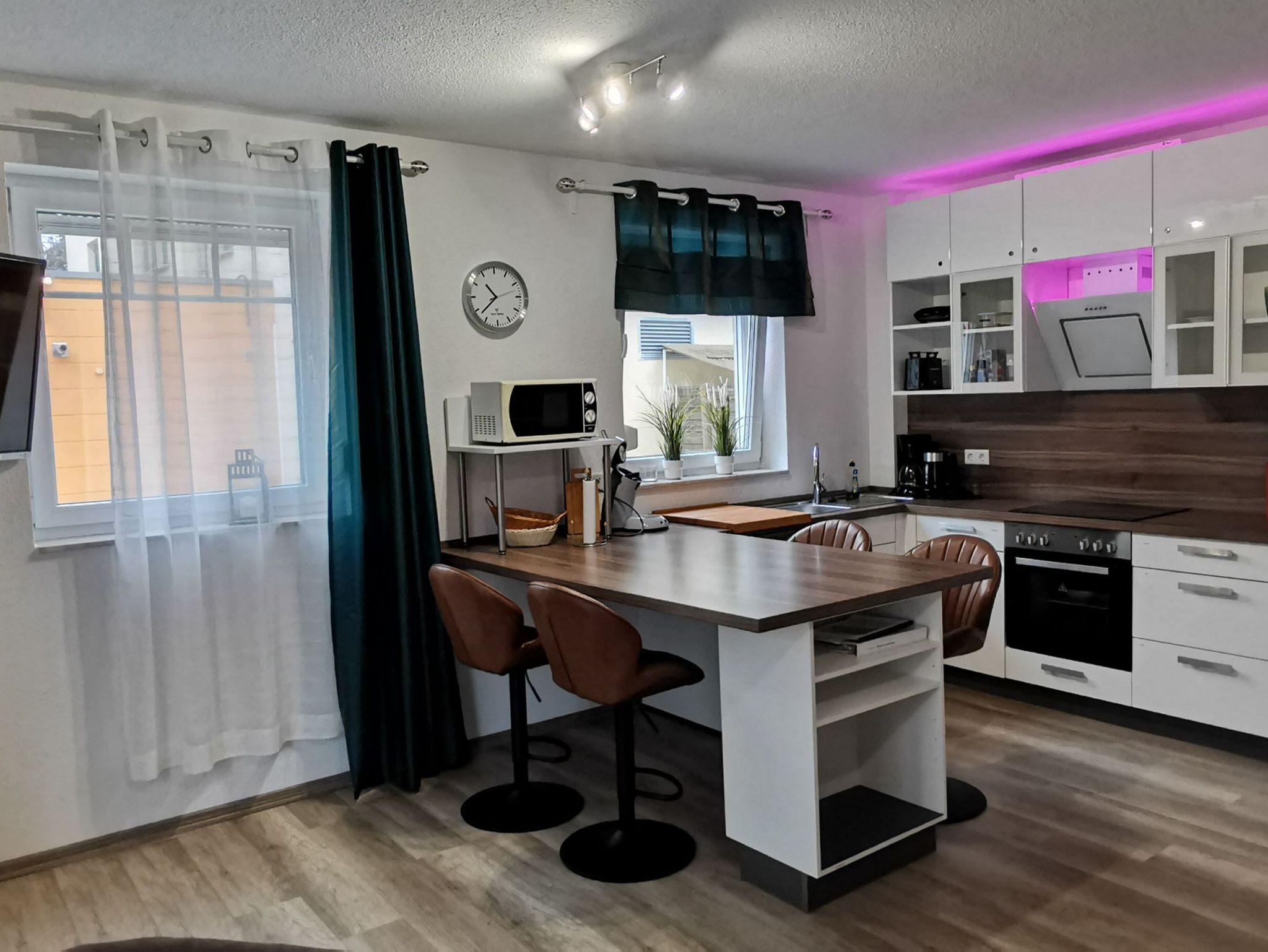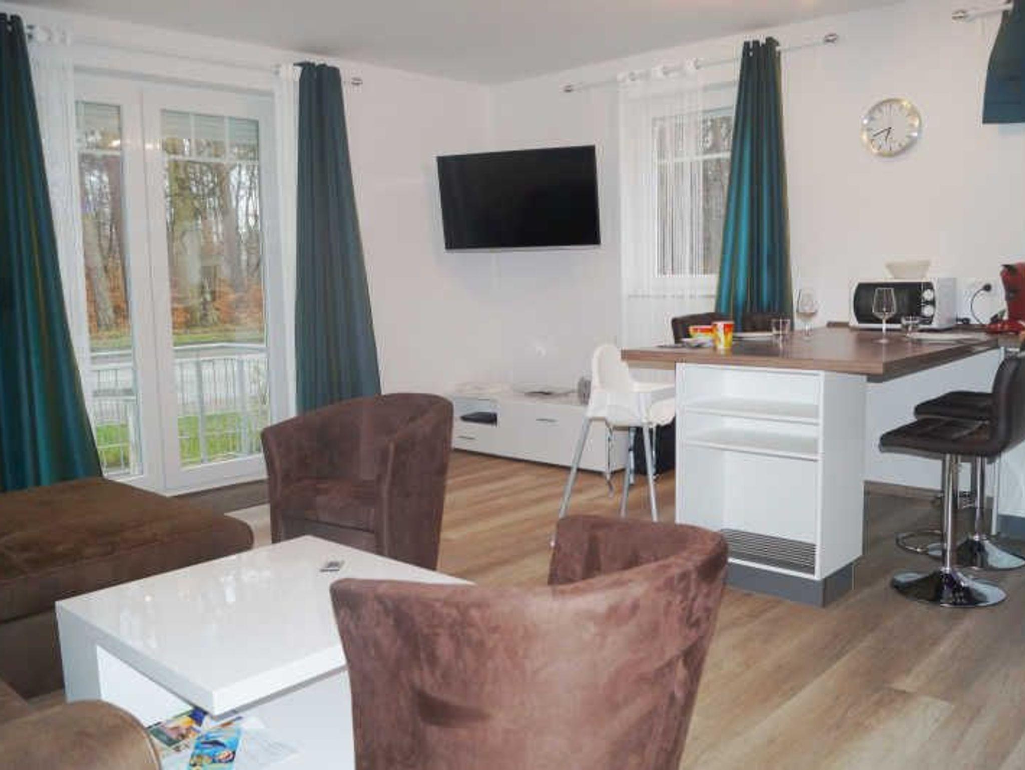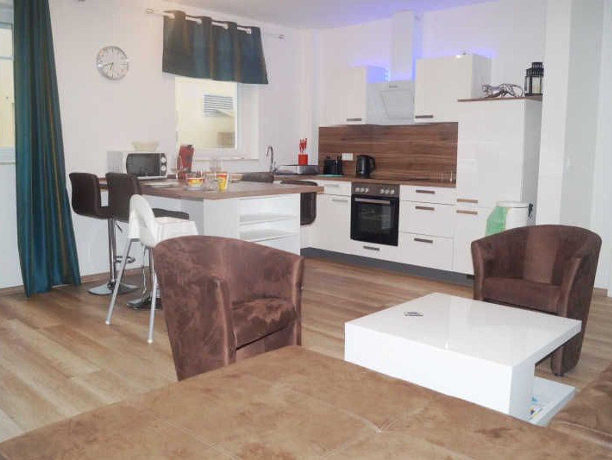 In der Ferienwohnung gibt es ein Wohnzimmer mit einer Couch und einem Fernseher, eine offene Küche mit Geschirrspüler, Backofen, Kühlschrank und einem Esstisch mit 4 Stühlen, ein Bad mit Dusche, WC, und Waschtisch sowie ein Schlafzimmer mit Fernseher, Doppelbett und Kleiderschrank.