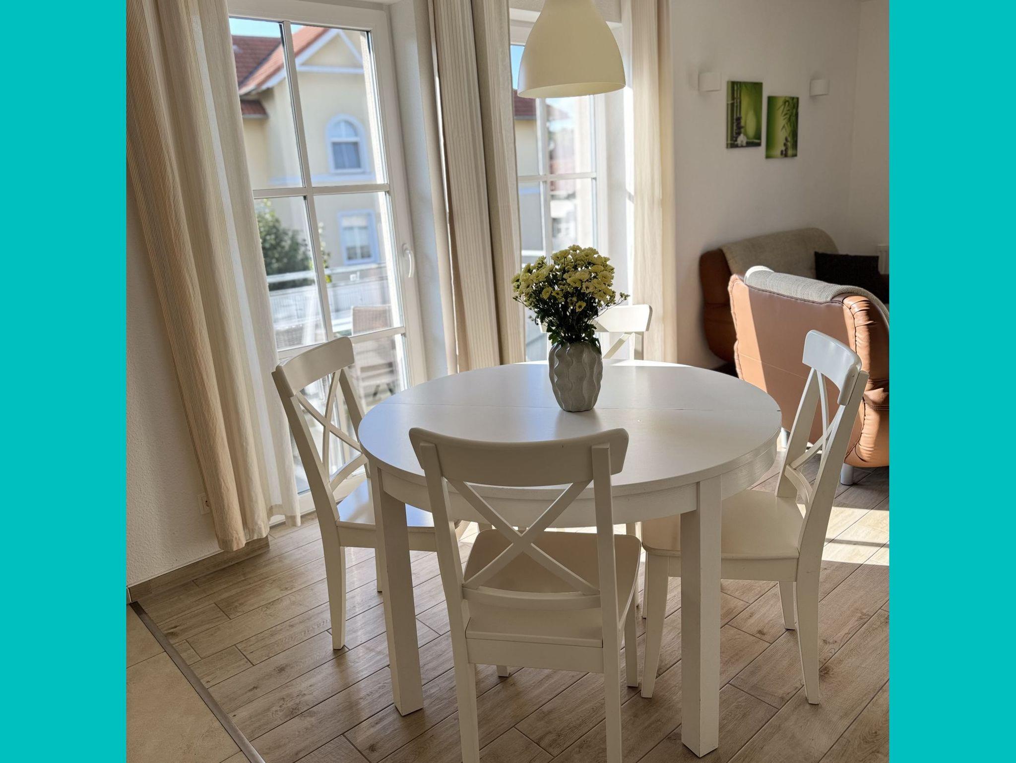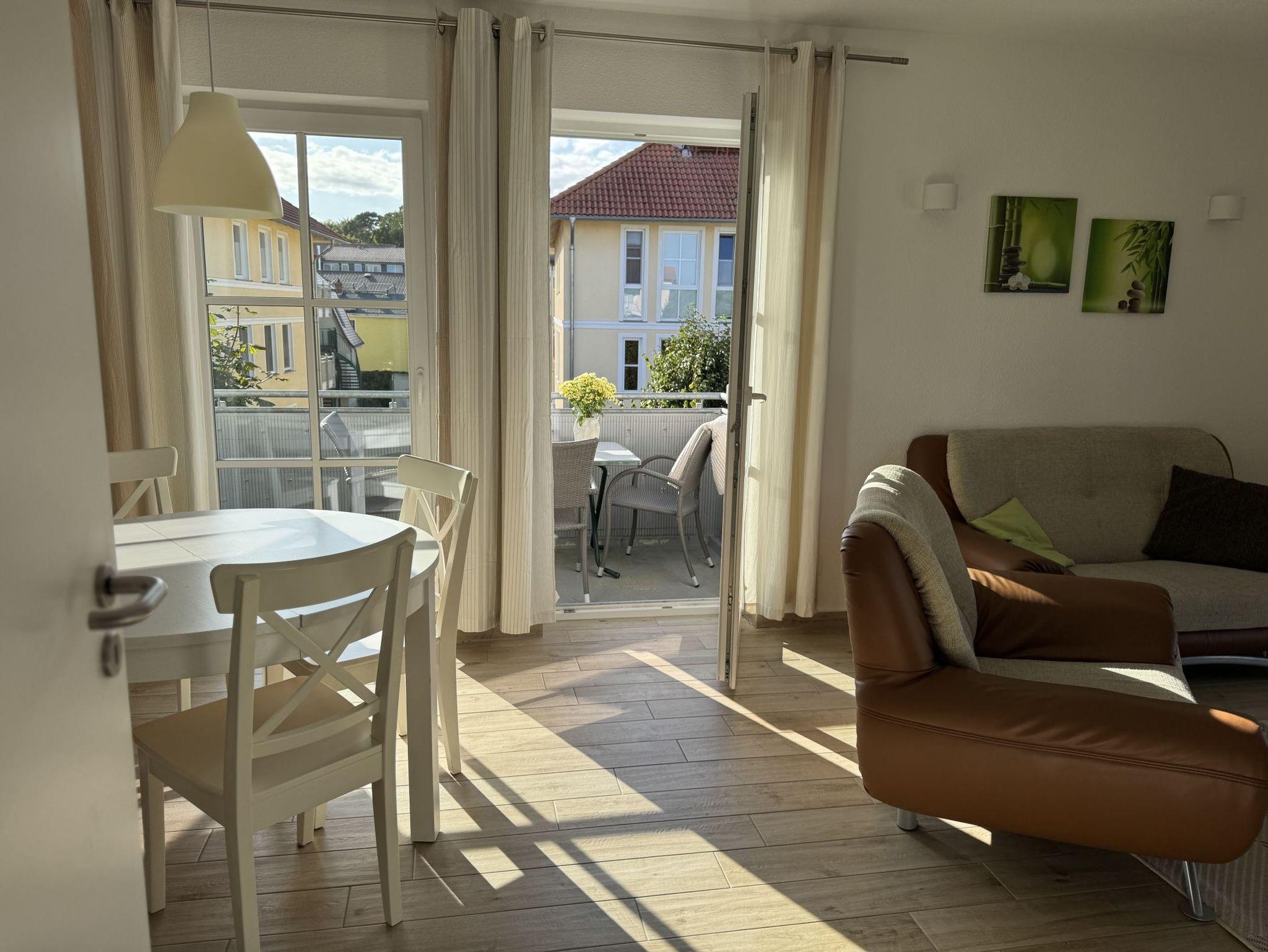 Der freundliche Wohnbereich bietet eine gemütliche Sitzecke mit Sofa und Sessel, einen LCD-Fernseher sowie direkten Zugang zum sonnigen Südwest-Balkon ? ausgestattet mit Tisch und 4 Stühlen. Ideal für entspannte Stunden an der frischen Ostseeluft.