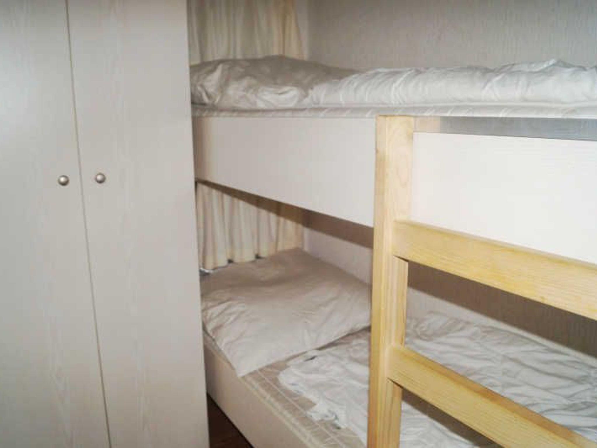 Ein Doppelbett steht in dem einem Schlafzimmer, ein Etagenbett in dem anderem Schlafzimmer.