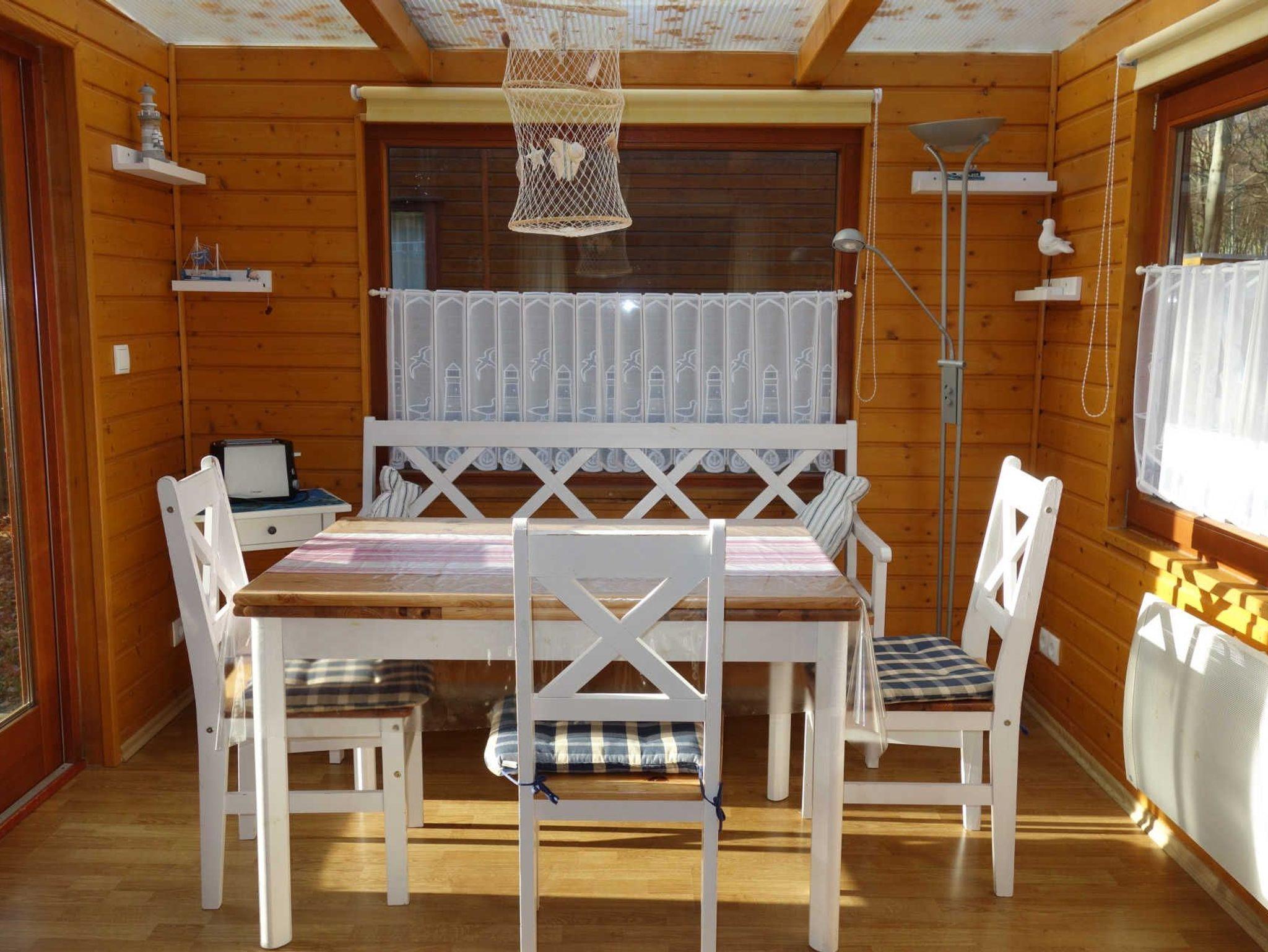 Im hellen Esszimmer befinden sich der Esstisch, eine Sitzbank und Stühle.