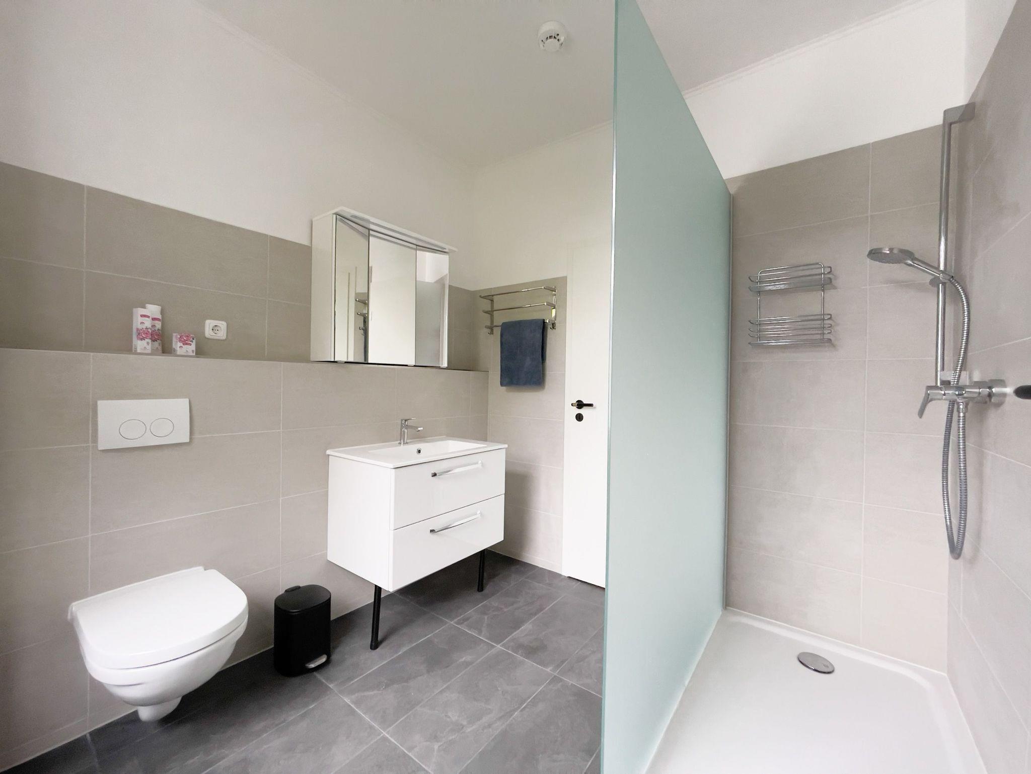 • Bad:mit Fenster, Dusche, Waschbecken, Toilette, Spiegel, Handtuchhalter, Regal
