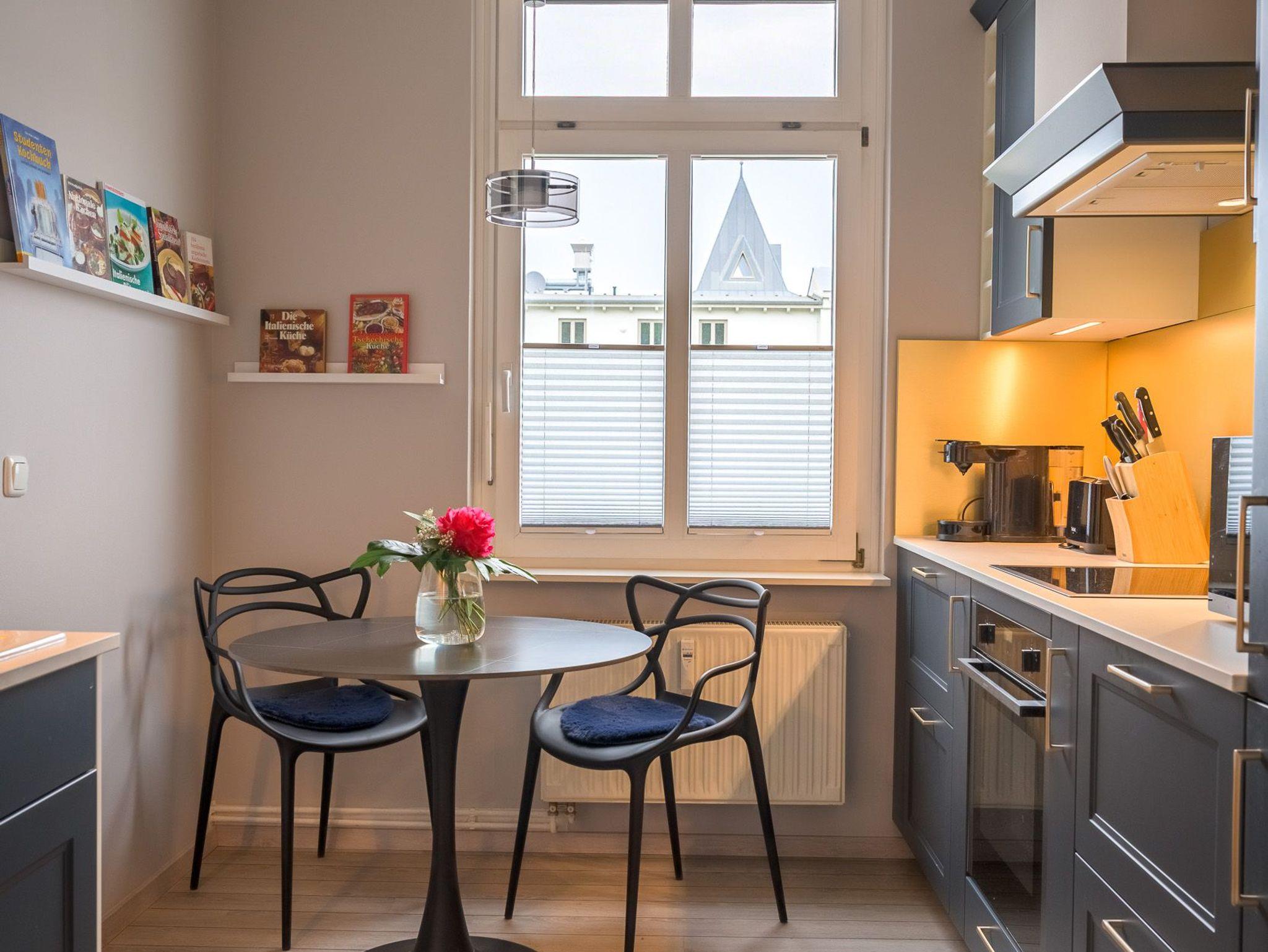 • Küche: und Essbereich für 2 Personen, komplett eingerichtete Einbauküche mit Backofen, Ceranfeld, Toaster, Kaffeemaschine, Wasserkocher, Kühlschrank mit Gefrierfach, Geschirrspüler, Mikrowelle, CD-Radio