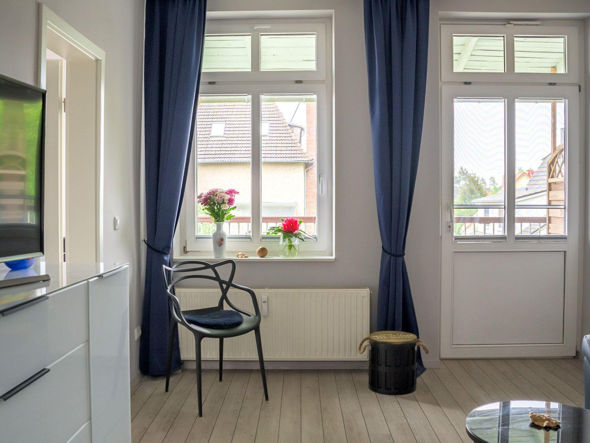 • Wohnzimmer: gemütliche Schlafcouch, Tisch, Flachbild-TV, TV Bank, Leselampe, direkter Zugang zum Balkon