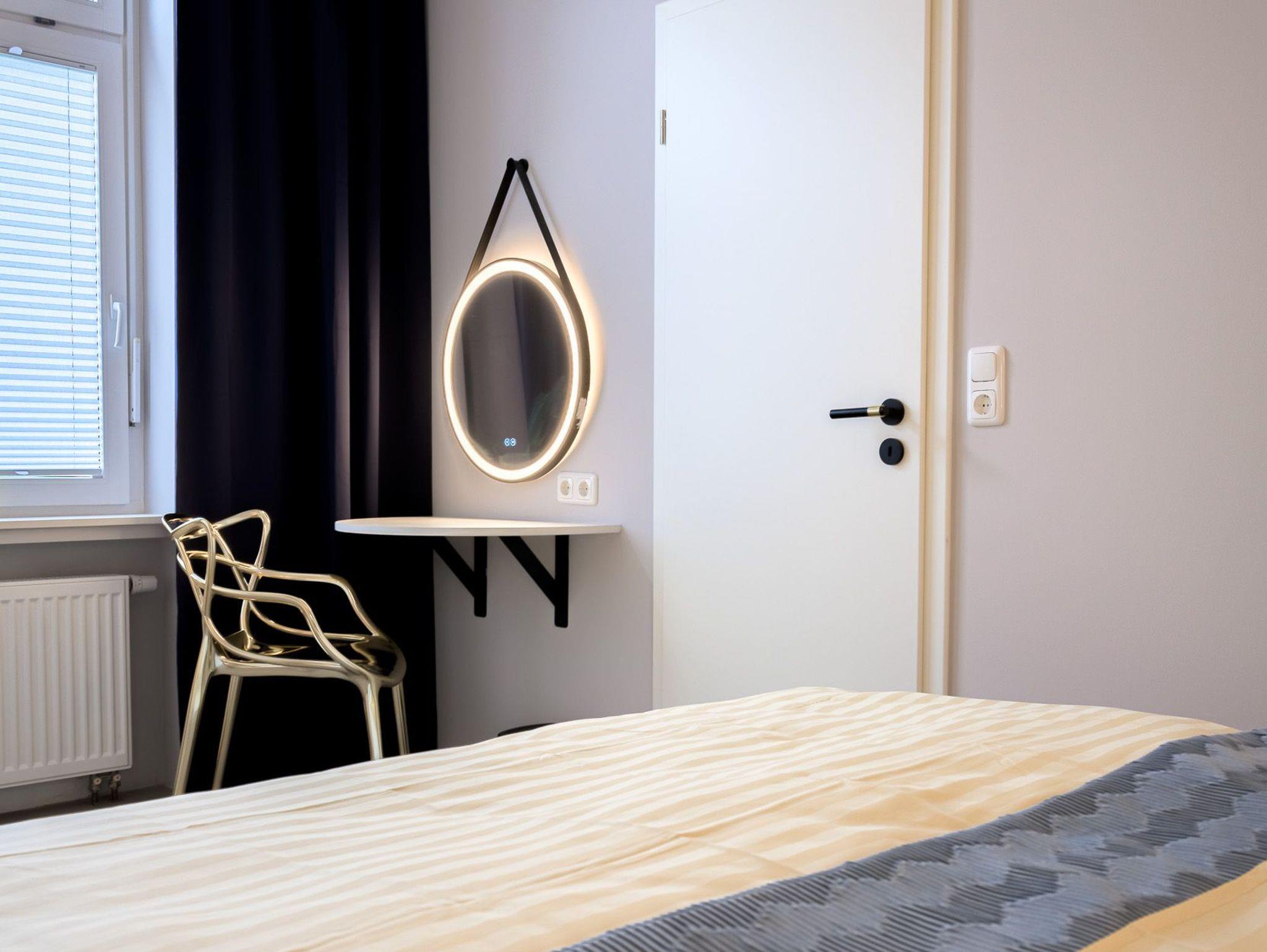 • Schlafzimmer I: Doppelbett mit zwei 90x200 cm Matratzen, Nachttische mit Lampen, Kleiderschrank, Sessel
