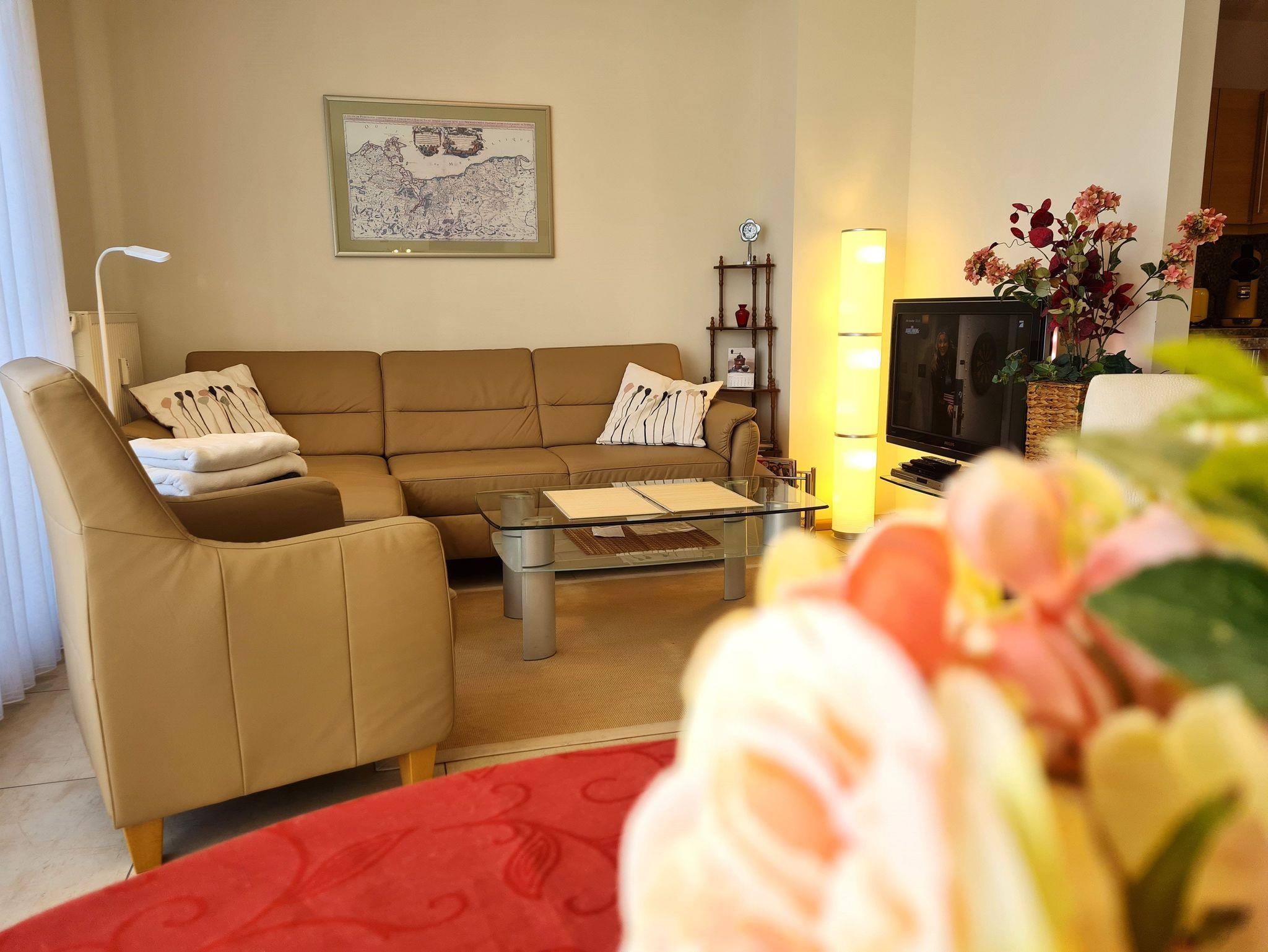 • Wohnzimmer: gemütliche Sitzecke mit bodentiefen Fenstern, Flachbild-TV, separate Essecke, Zugang zum Balkon, Stereoanlage mit CD