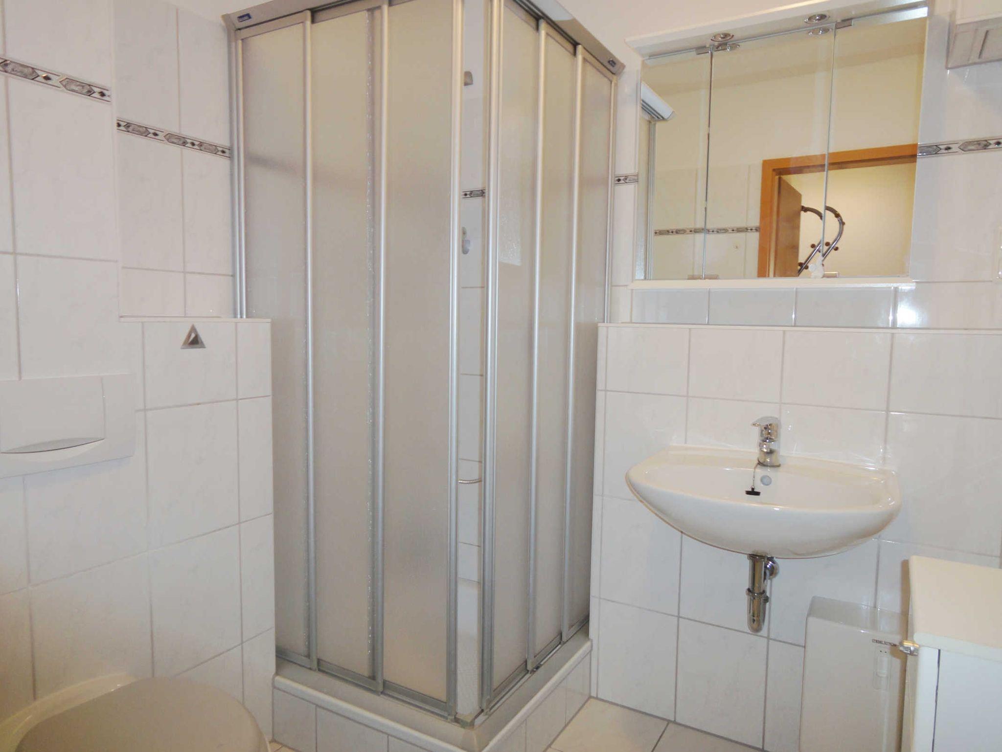 Das geflieste Bad ist mit einer Dusche, einem Waschtisch und einem WC ausgestattet.