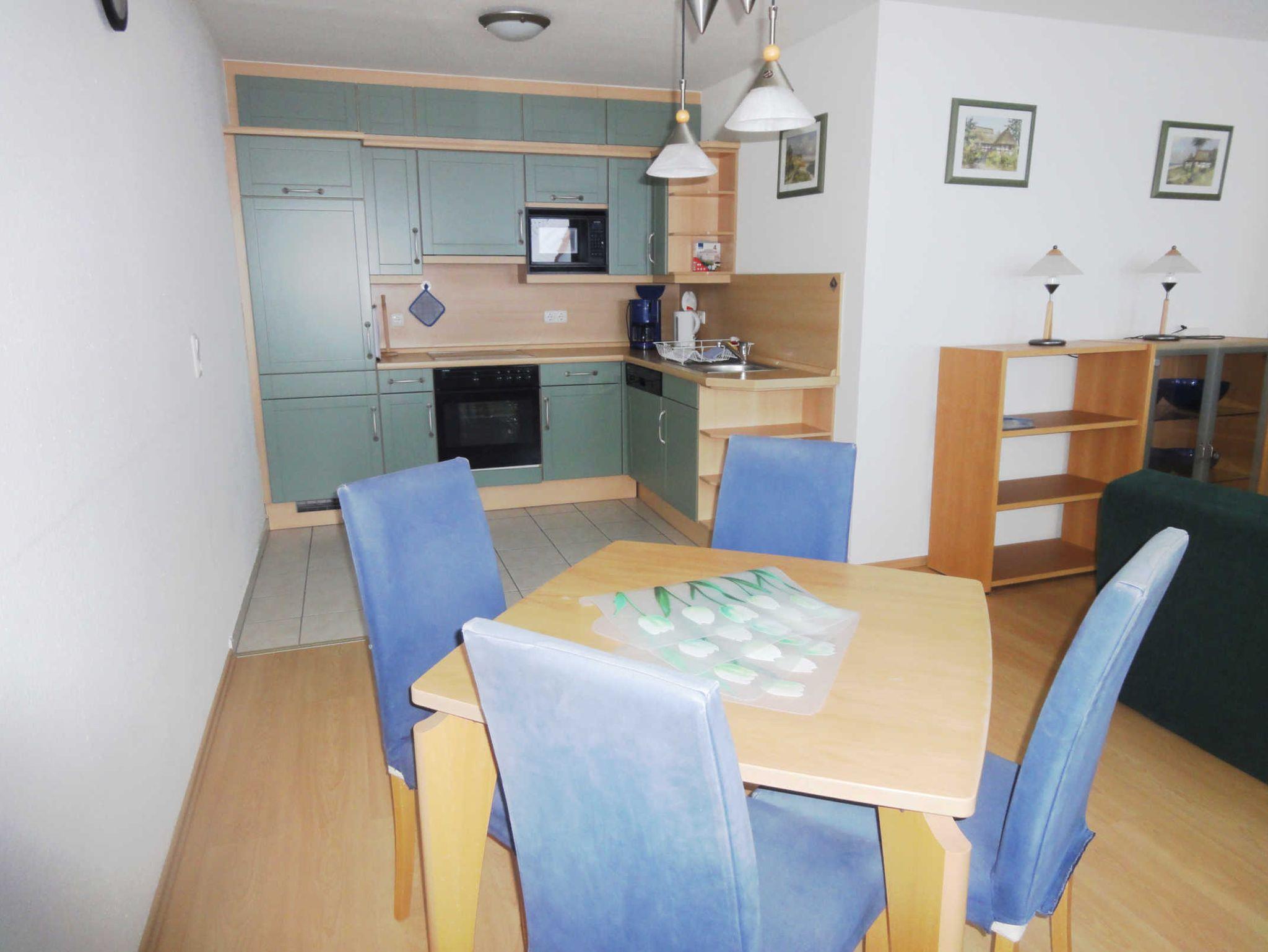 In der ins Wohnzimmer integrierten Küchenzeile befinden sich ein Geschirrspüler, 2 Ceranfelder, ein Kühlschrank und diverses Geschirr sowie ein Esstisch mit 3 Stühlen.