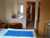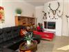 Das große Wohnzimmer verfügt über einen Kamin, einen Esstisch mit 6 Stühlen, einer gemütlichen Couchgarnitur, einem Radio und einem Fernseher. Im Schlafzimmer steht ein Doppelbett.