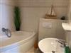 Im gefliesten Bad sind eine Eckbadewanne, eine Dusche und ein WC untergebracht.