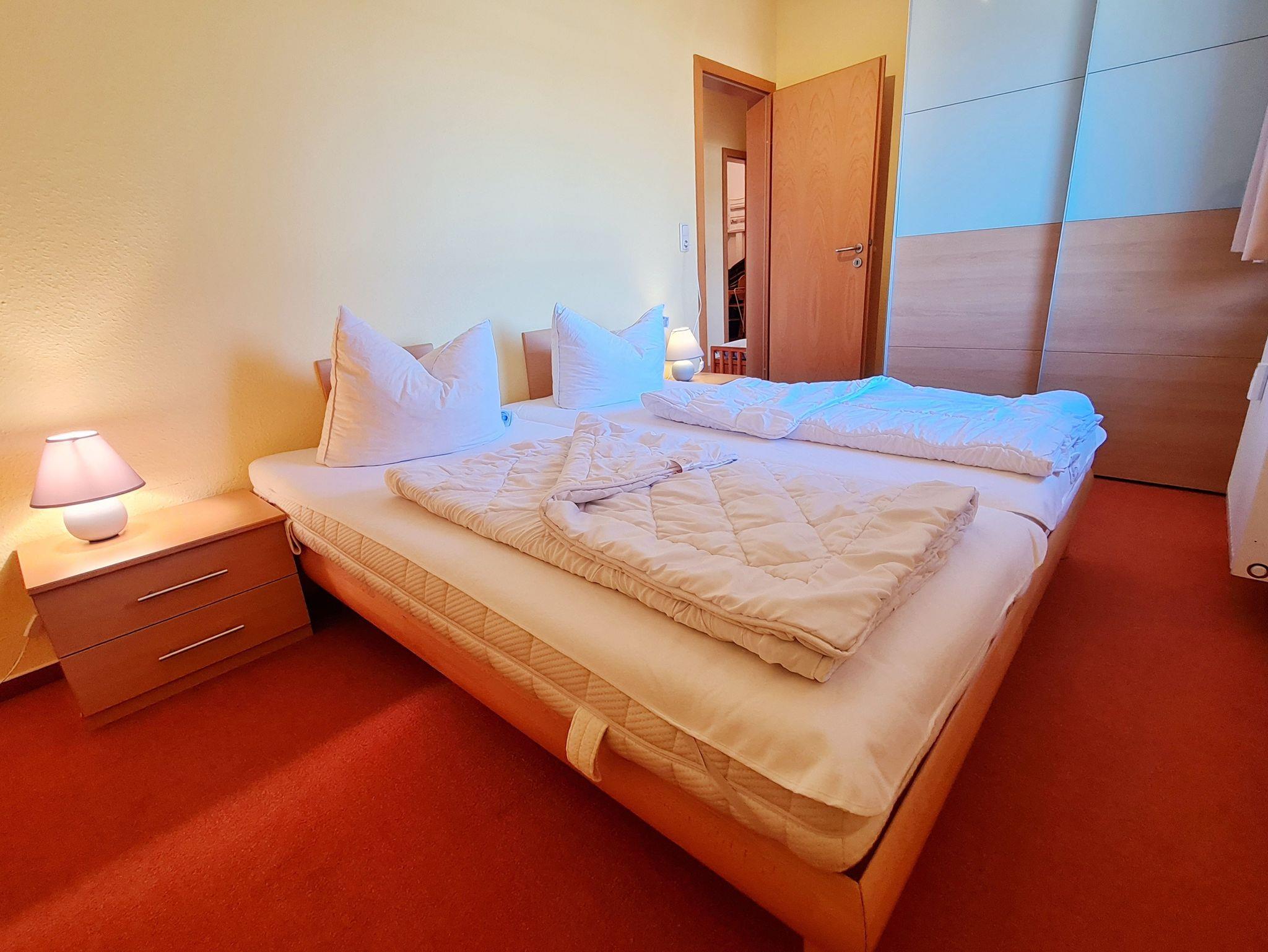 • I Schlafzimmer: Doppelbett mit zwei Einzelmatratzen 90x200 cm, 3-türiger Schrank, Nachttische, Lampen, ausreichend Platz zum Stellen von Reisebett