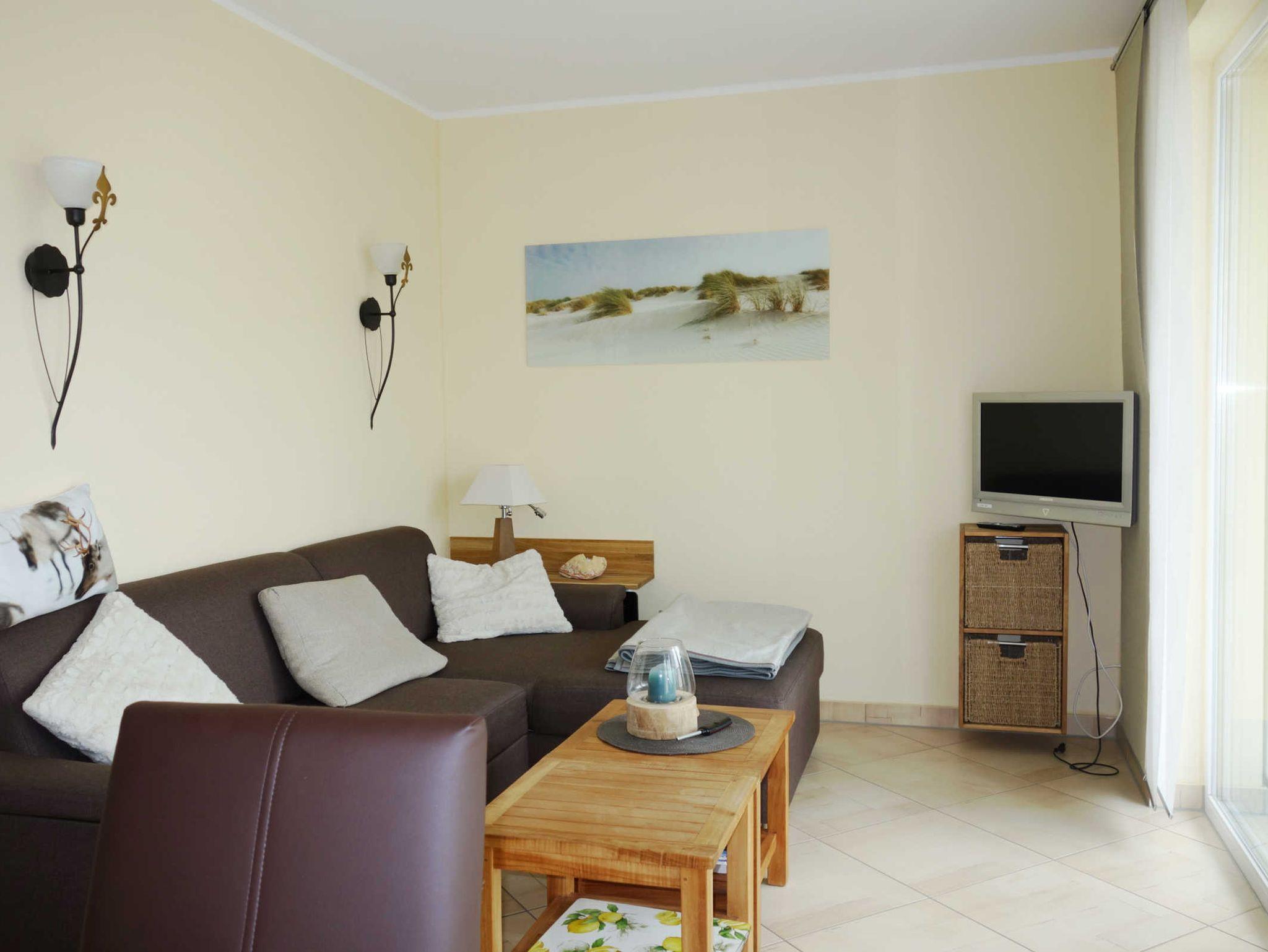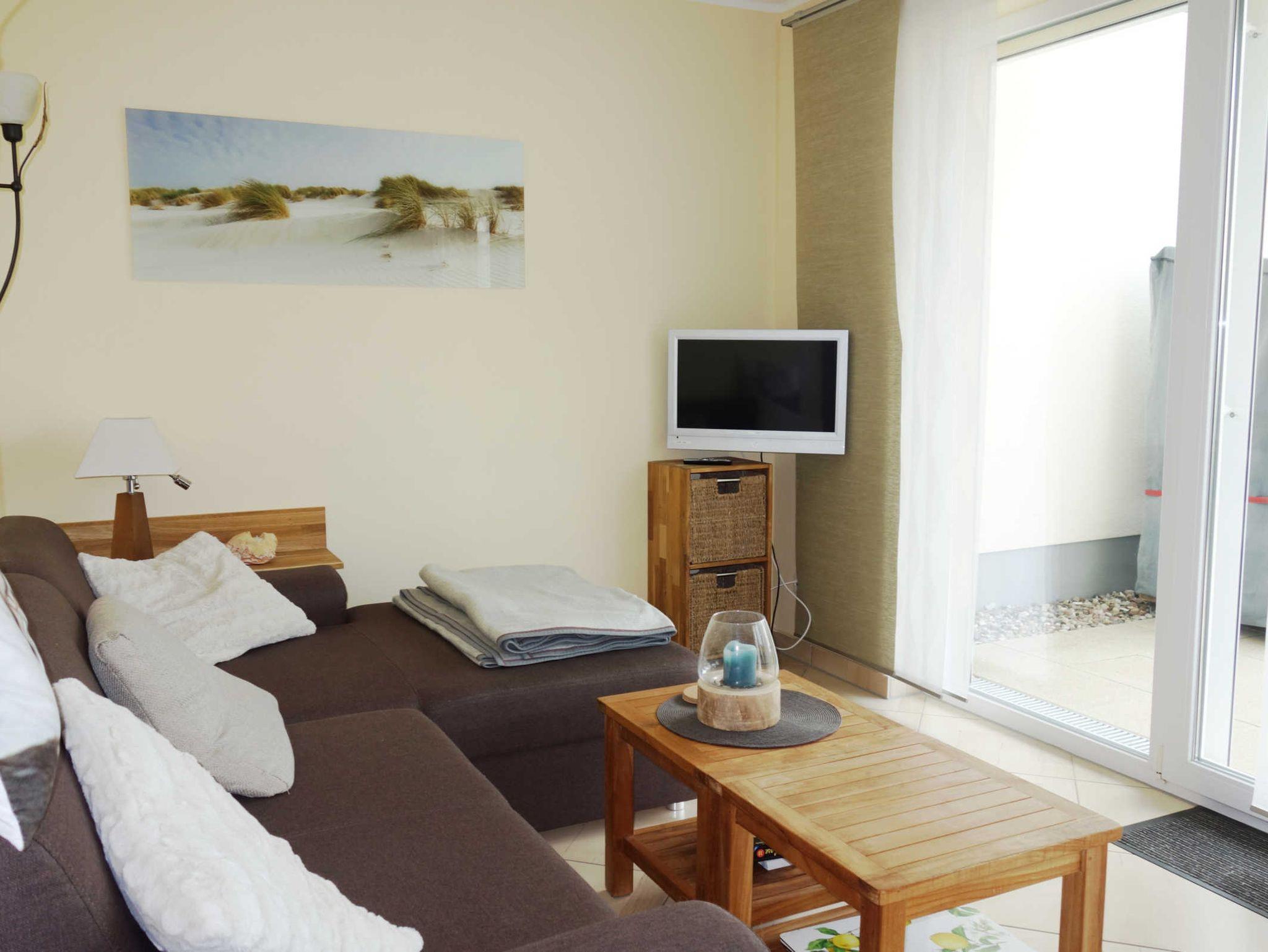 2 Zimmer Ferienwohnung im Ferienwohnpark Küstenwald mit Terrasse, Schlafzimmer, Küchenzeile, Bad mit Dusche und WC, Wohnzimmer mit Couch und Flachbild-TV, PKW-Stellplatz