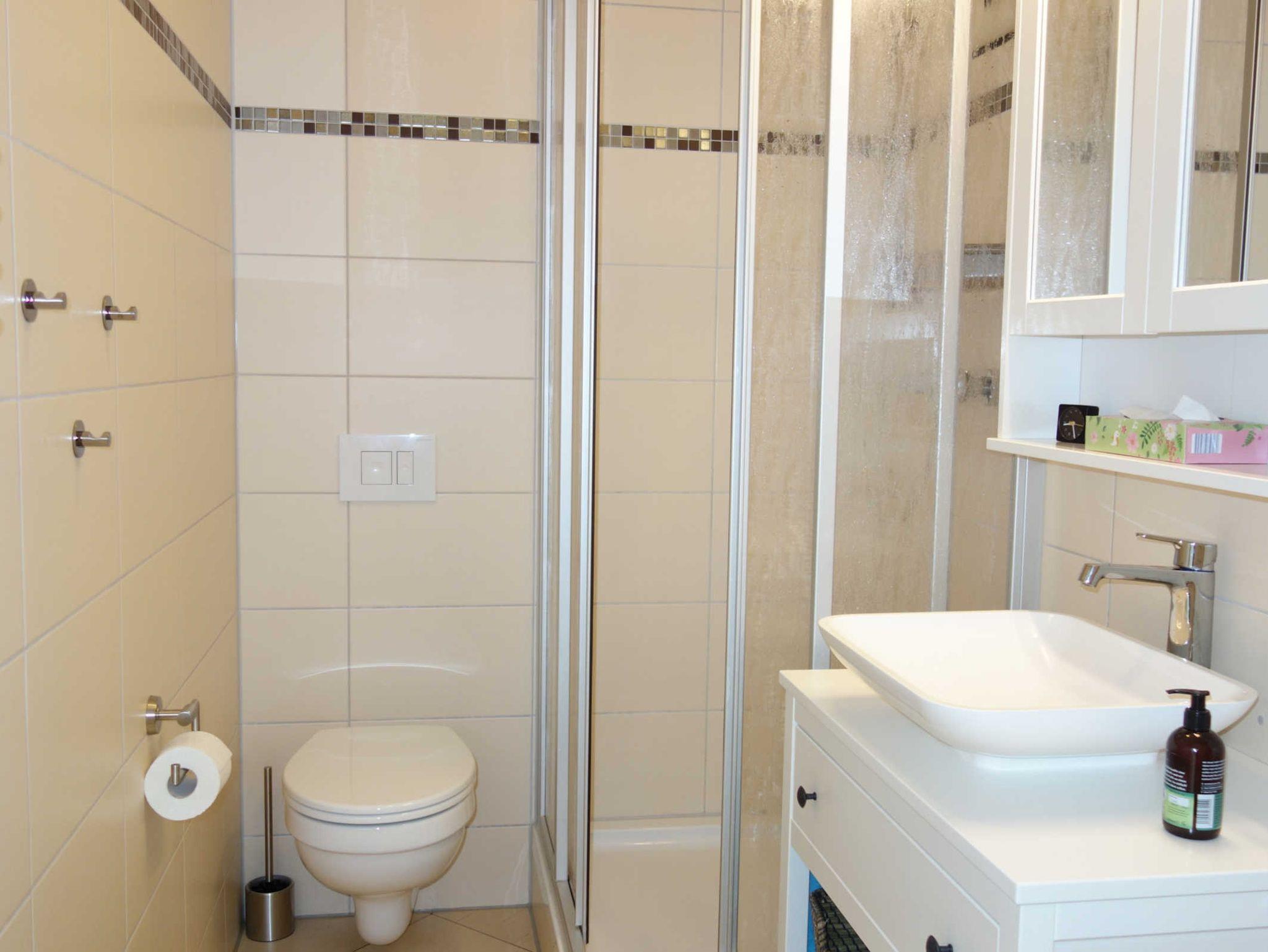 Das Bad verfügt über einen Waschtisch, ein WC und eine Dusche. Im Schlafzimmer befindet sich ein Doppelbett mit 2 Ablageflächen.