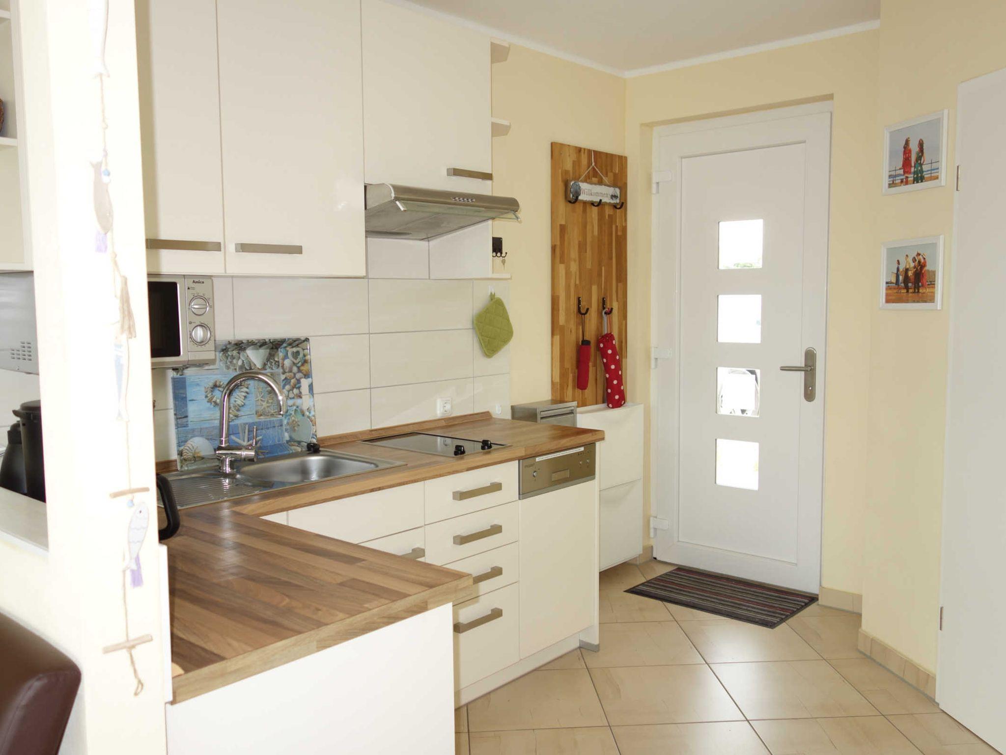 Die voll ausgestattete Küche bietet 2 Kochfelder, Geschirrspüler, Mikrowelle, Kaffeemaschine und einen Wasserkocher. Geschirr, Besteck und Kochtöpfe sind ausreichend vorhanden.