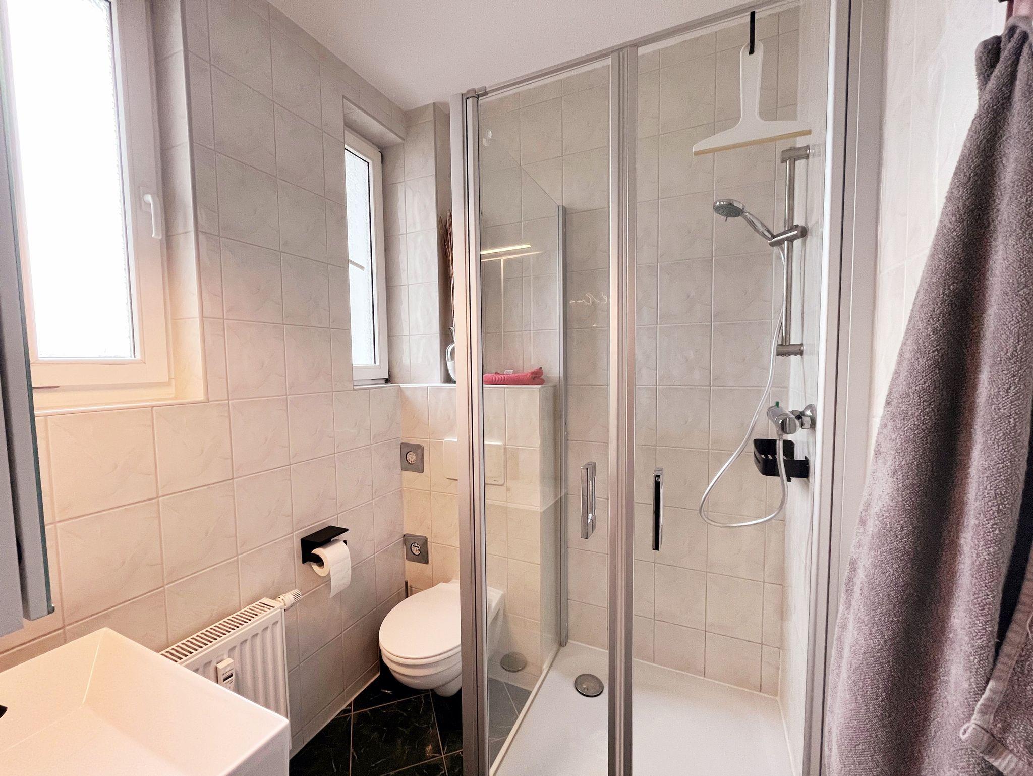 • Bad: Tageslichtbad mit zwei Fenstern, Dusche, WC, Waschtisch mit Unterschrank und beleuchtetem Spiegelschrank