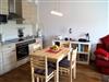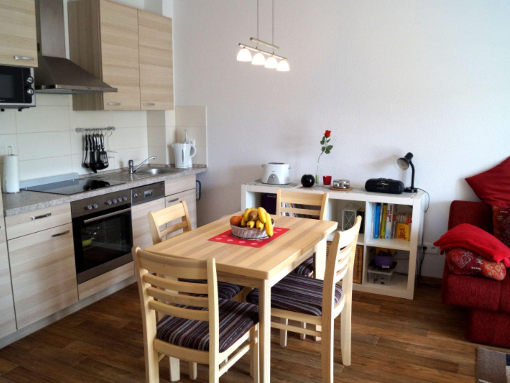 Im integrierten Küchenbereich befinden sich unter anderem ein Herd mit Ceranherd mit 4 Kochfeldern, ein Geschirrspüler, ein Kühlschrank mit großem, separaten Gefrierfach, eine Mikrowelle, eine Kaffeemaschine und ein Wasserkocher.