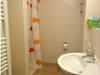 Das Bad hat eine bodengleiche Dusche und ein WC.