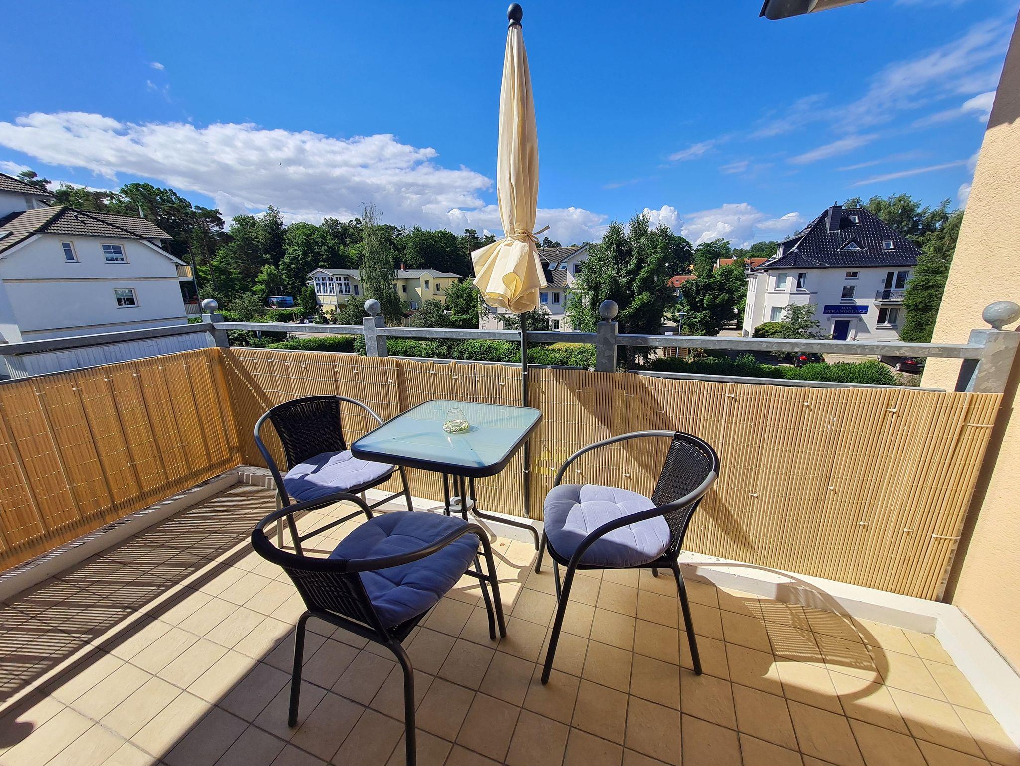 • Balkon: Westausrichtung, Tisch, Stühle, Sonnenschirm, Balkonumrandung