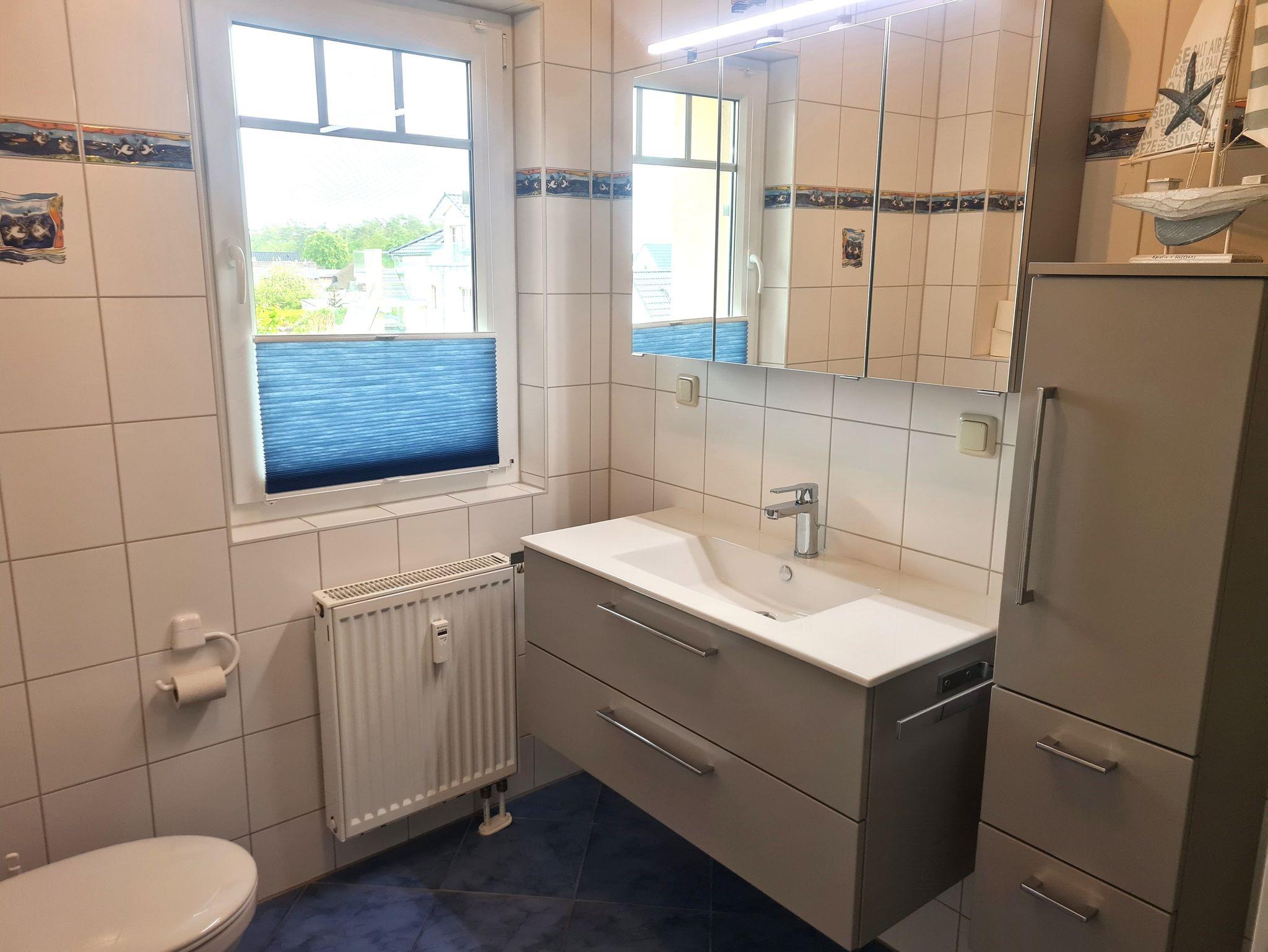 • Bad: mit Fenster, Dusche, Waschbecken, Toilette, Spiegelschrank, Schrank, Handtuchhaken
