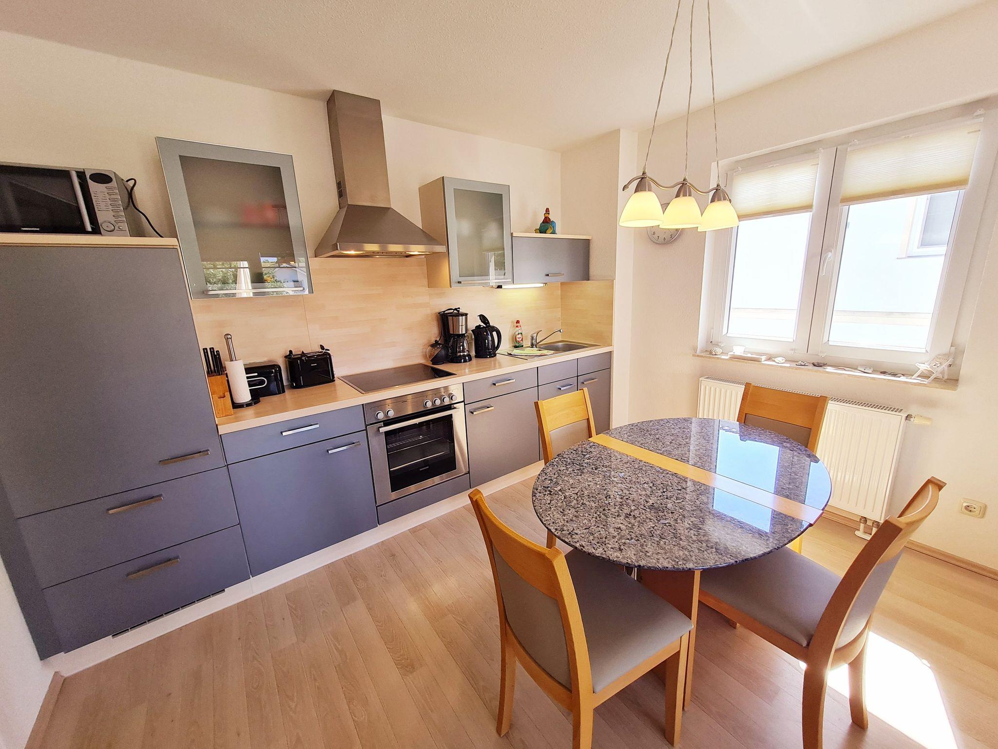 • Küche und Essbereich für 4 Personen (Hochtisch als Esstisch mit 4 Tresenstühlen) offen zum Wohnzimmer, komplett eingerichtete Einbauküche mit Backofen, Ceranfeld, Toaster, Kaffeemaschine, Wasserkocher, Kühlschrank mit Gefrierfach, Mikrowelle (ohne Geschirrspüler)